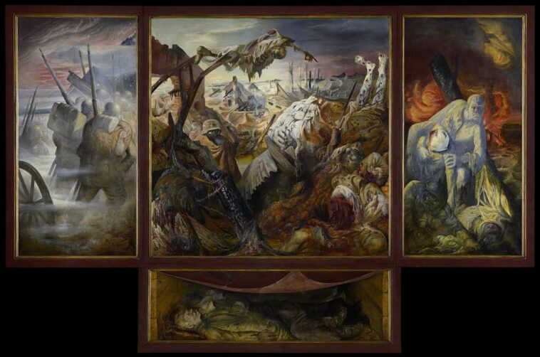 Ο Πόλεμος του Otto Dix (1891-1969) δεν αφήνει περιθώριο για αμφιβολίες. Υιοθετώντας τη διάταξη των θρησκευτικών πολύπτυχων της Αναγέννησης και του μεγάλου εκπροσώπου της γκροτέσκας, σκληρής εκδοχής της στη Γερμανία Matthias Grünewald, ο Dix προκαλεί όχι το δέος απέναντι στον Θεό, αλλά απέναντι στον άνθρωπο. Ο καλλιτέχνης ήταν παρών, βίωσε τη φρίκη του πολέμου ως στρατιώτης και προσπαθεί με κάθε εκφραστικό, αλλά και πλαστικό μέσο να την περάσει στον θεατή.