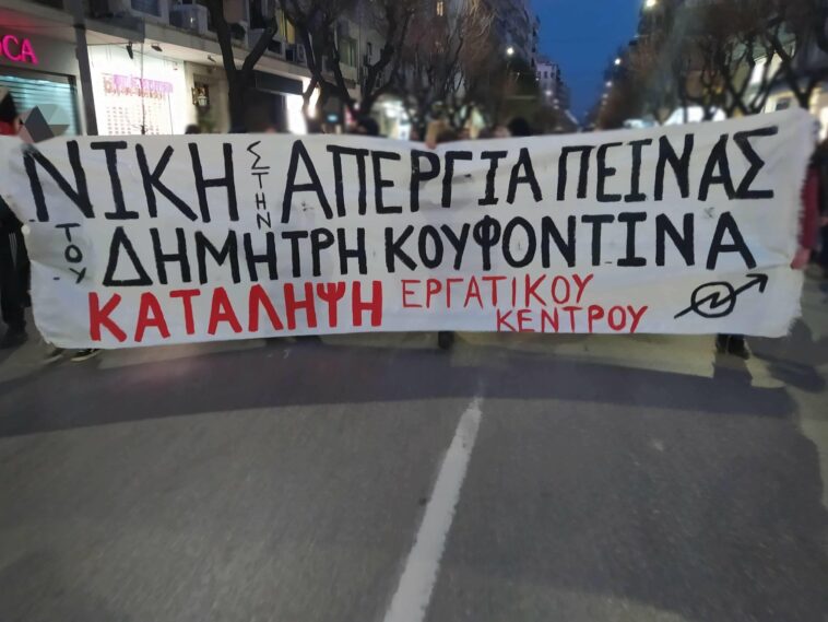 Μετά τη μαζικότερη διαδήλωση που πραγματοποιήθηκε χθες στη Θεσσαλονίκη για την υπεράσπιση των δικαιωμάτων του απεργού πείνας νέο κάλεσμα απευθύνουν συλλογικότητες του αντιεξουσιαστικού χώρου και της αριστεράς για συγκέντρωση στις 18:00 στο άγαλμα Βενιζέλου. Παράλληλα κάλεσμα απευθύνει και η Κατάληψη Εργατικού Κέντρου για την αλληλεγγύη στον απεργό πείνας Δημήτρη Κουφοντίνα.