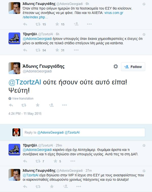 Ψεύτη χαρακτήρισε ο πρώην υπουργός Υγείας, βουλευτής της ΝΔ Α. Γεωργιάδης χρήστη του twitter και πρώην καρκινοπαθή όταν σε ένα tweet του υπενθύμισε στον πρώην Υπουργό την δήλωση του τελευταίου στην Washington Post ότι ο καρκίνος θεωρείται επείγουσα περίπτωση μόνο στο τελικό του στάδιο. Ο Α. Γεωργιάδης χαρακτήρισε τον συνομιλητή του ψεύτη προκαλώντας όπως είναι φυσικό τα πυρά πολλών χρηστών του twitter.