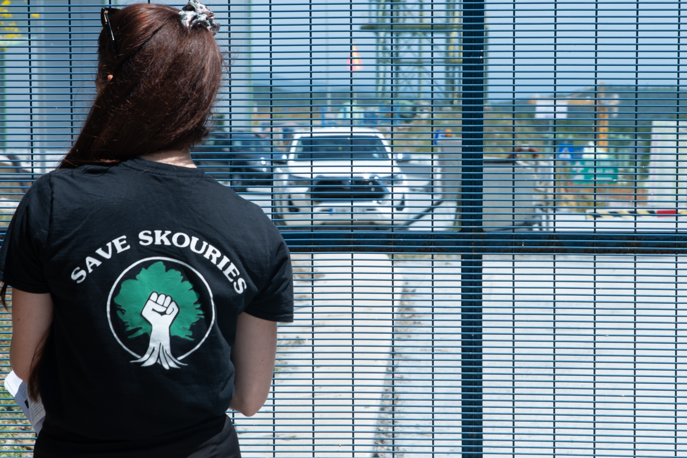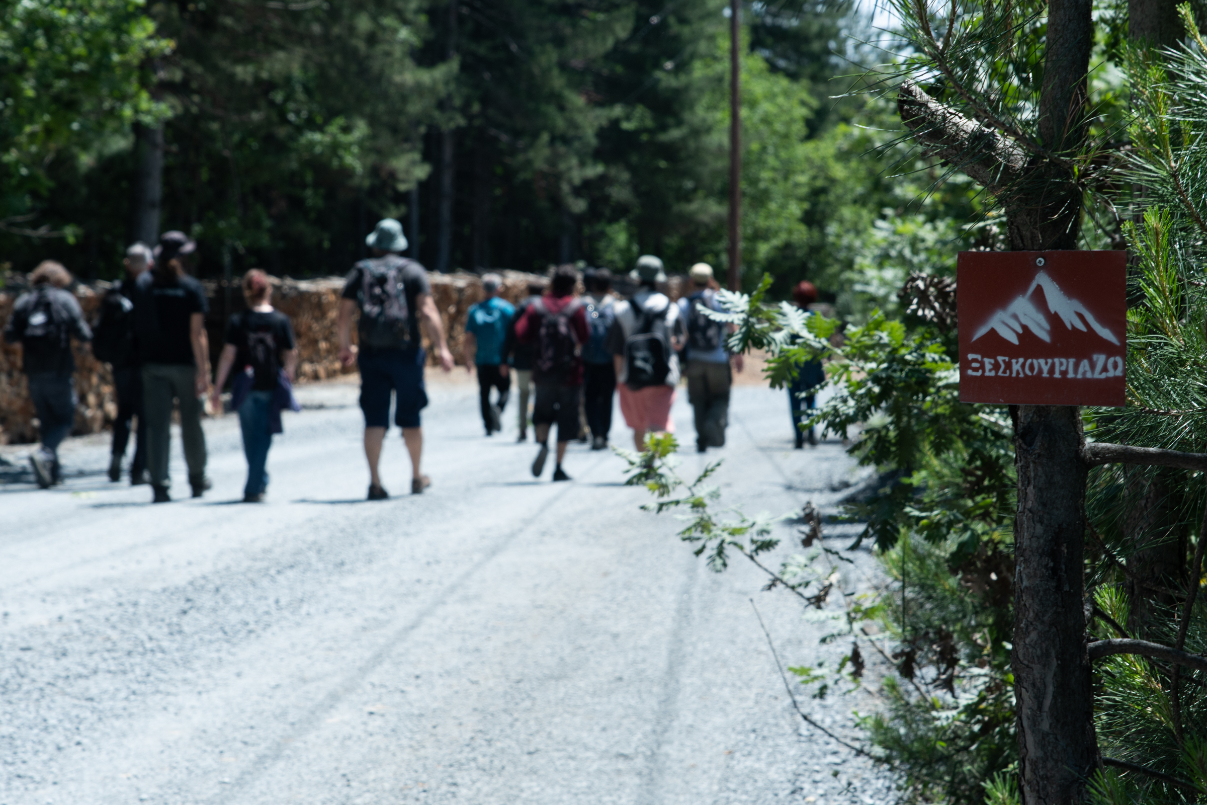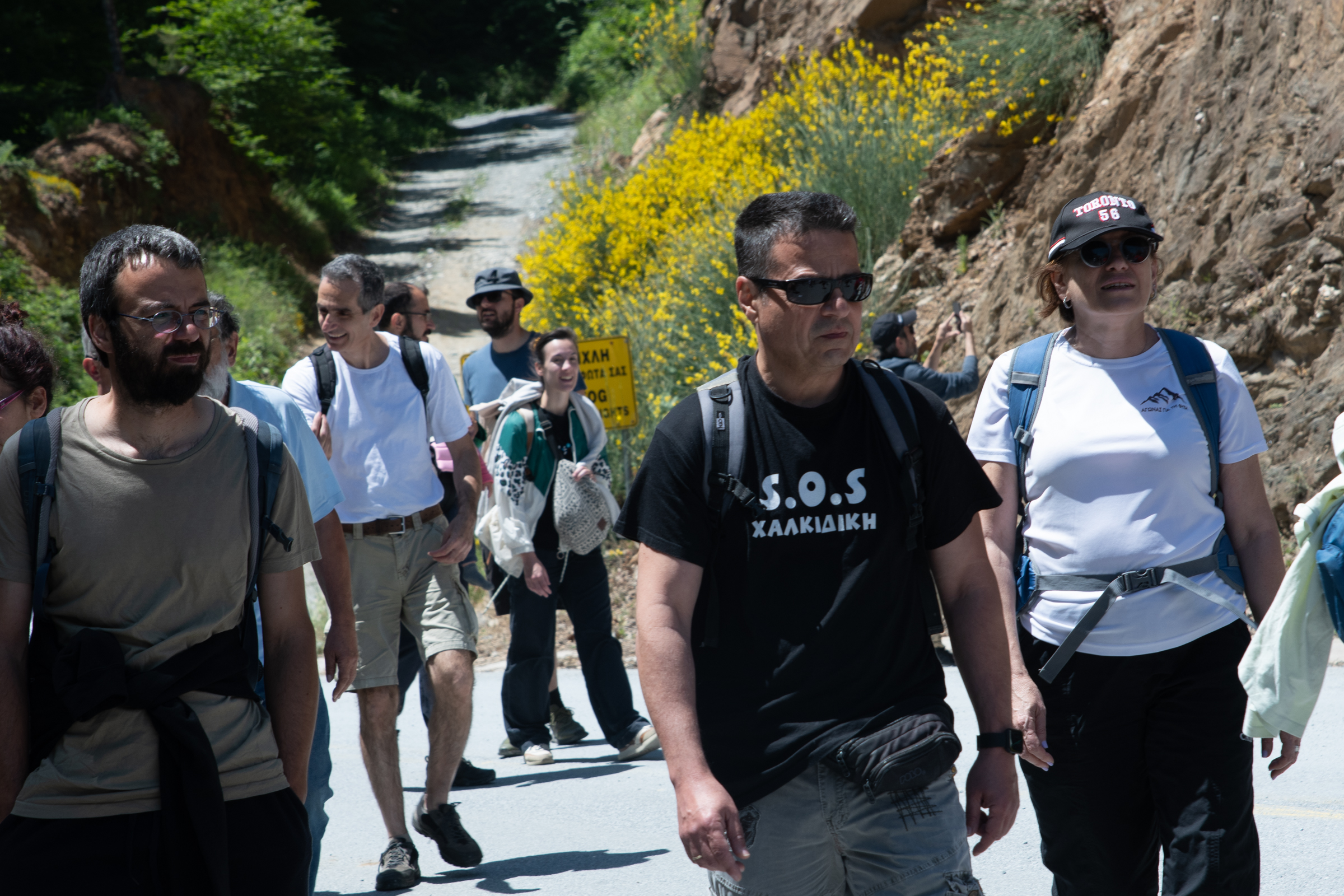 Με αφετηρία την πλατεία της Μεγάλης Παναγίας όπου έγινε μικροφωνική ενημέρωση για τις νέες εξελίξεις και προθέσεις της εταιρείας, στη συνέχεια ξεκίνησε η πορεία κατοίκων της περιοχής και αλληλέγγυων, σε μια διαδρομή εννέα χιλιομέτρων μέσα από γραφικά μονοπάτια γεμάτα καρπούς και ποικιλομορφία χλωρίδας, τα οποία παρά την απαράμιλλη ομορφιά, την επιβλητική φύση και το δέος που προκαλεί το αρχέγονο δάσος των Σκουριών κάθε εποχή, ένιωθε κανείς αβίαστα αυτόν τον σημαντικό πνεύμονα του τόπου μας να αιμορραγεί. Ανάμεσα στα πουλιά και τα θροΐσματα των γιγάντιων δέντρων ακούγονταν εκρήξεις, ανάμεσα στα πεσμένα φύλλα σκοντάφταμε σε εκ νέου τοποθετημένες κορδέλες και πασσάλους που χαράσσουν νέες αποψιλώσεις ολόκληρης πλαγιάς. Καινούριοι φράχτες επεκτείνουν την ήδη ολοκληρωτική καταστροφή, καινούρια οδικά δίκτυα ξεφύτρωσαν ενώ υλοποιούνται ήδη τα επεκτατικά έργα των εγκαταστάσεων. Είδαμε το θηριώδες εργοστάσιο κι αντικρύσαμε μια τεράστια βιομηχανική περιοχή εκεί που κάποτε ήταν παρθένες δασικές διαδρομές. Φτάσαμε στο πλησιέστερο σημείο του open pit για να καταλήξουμε στο χώρο όπου πραγματοποιείται επί σειρά ετών το δεκαήμερο κάμπιγκ ενάντια στις εξορύξεις χρυσού-χαλκού.