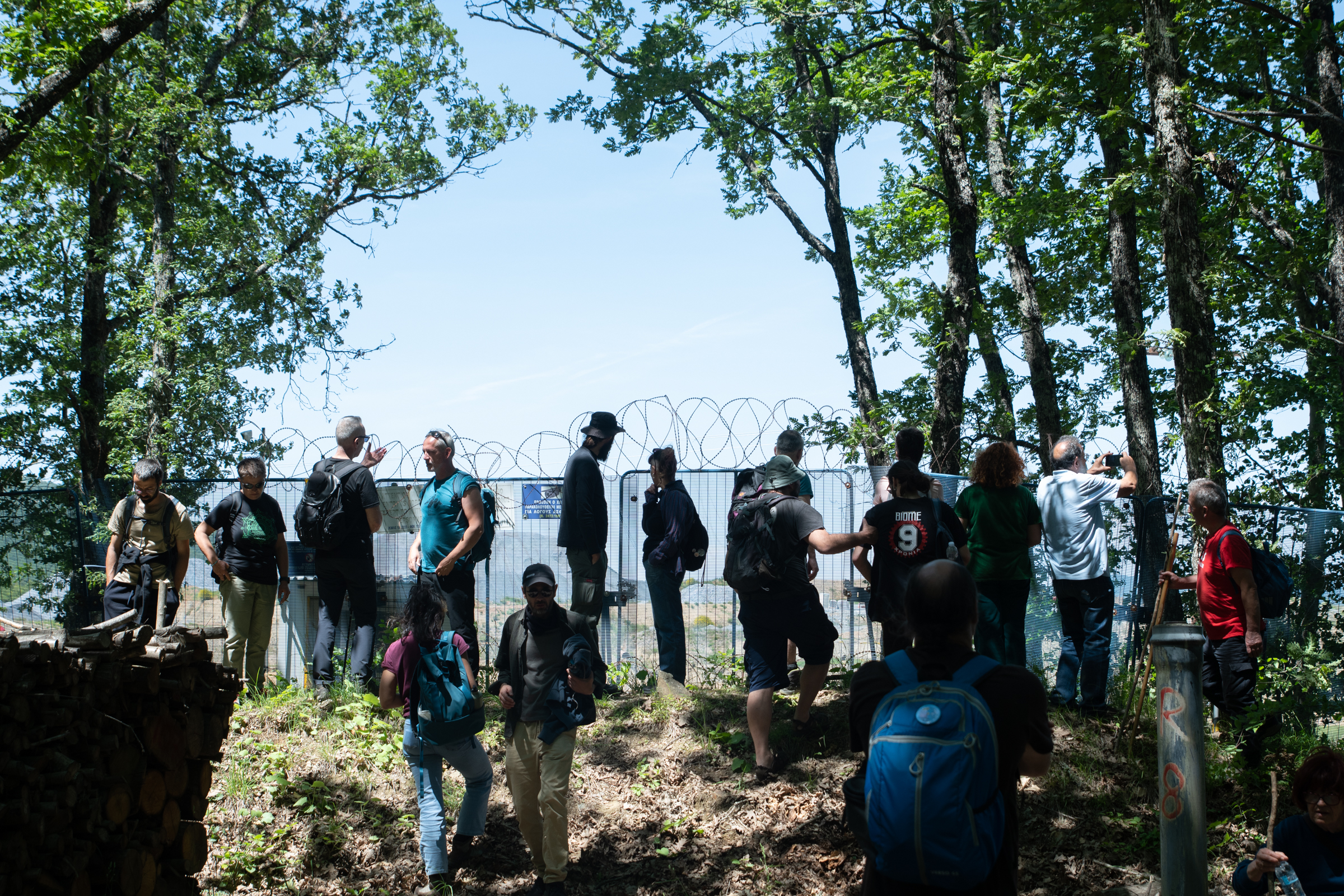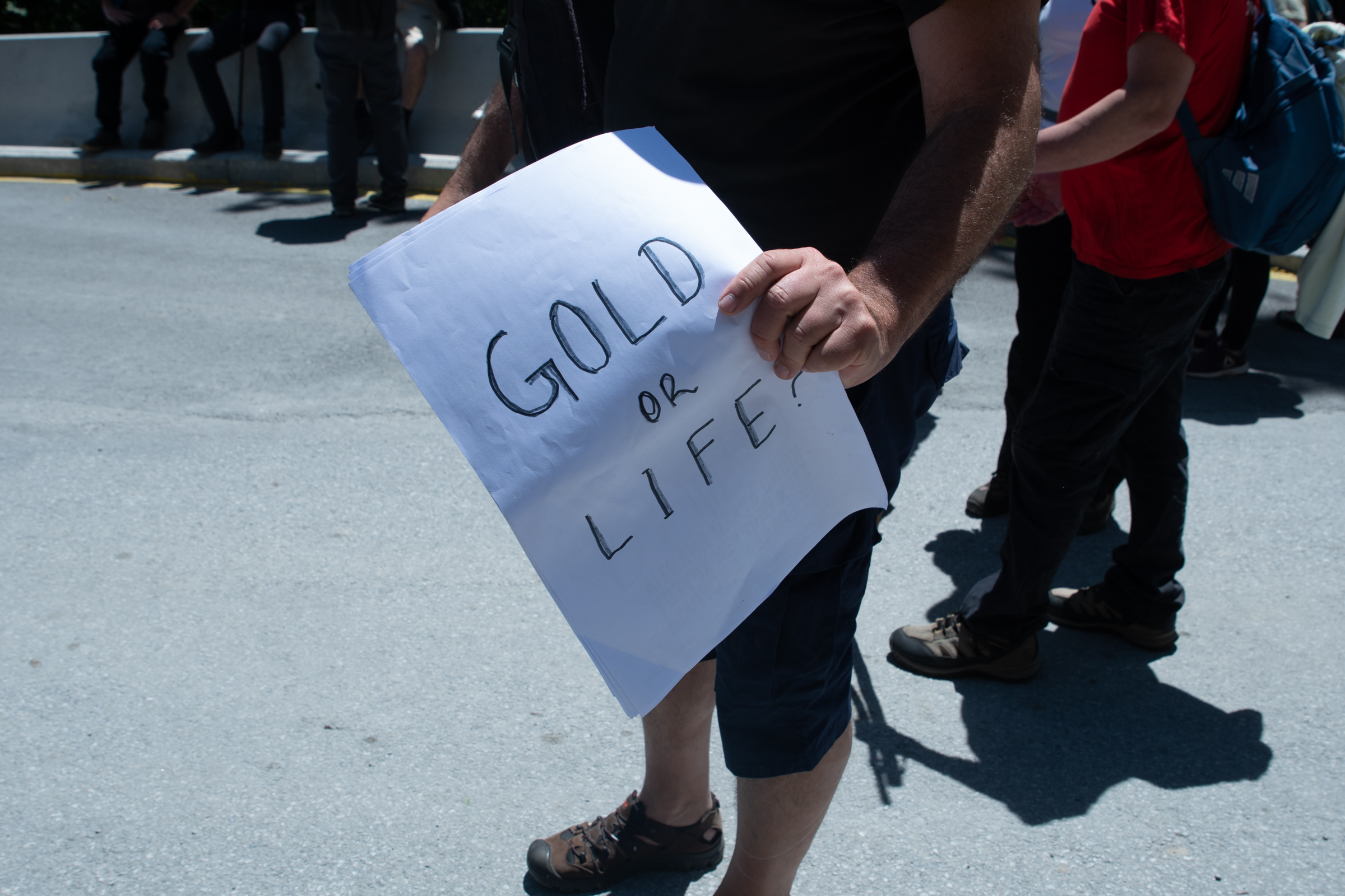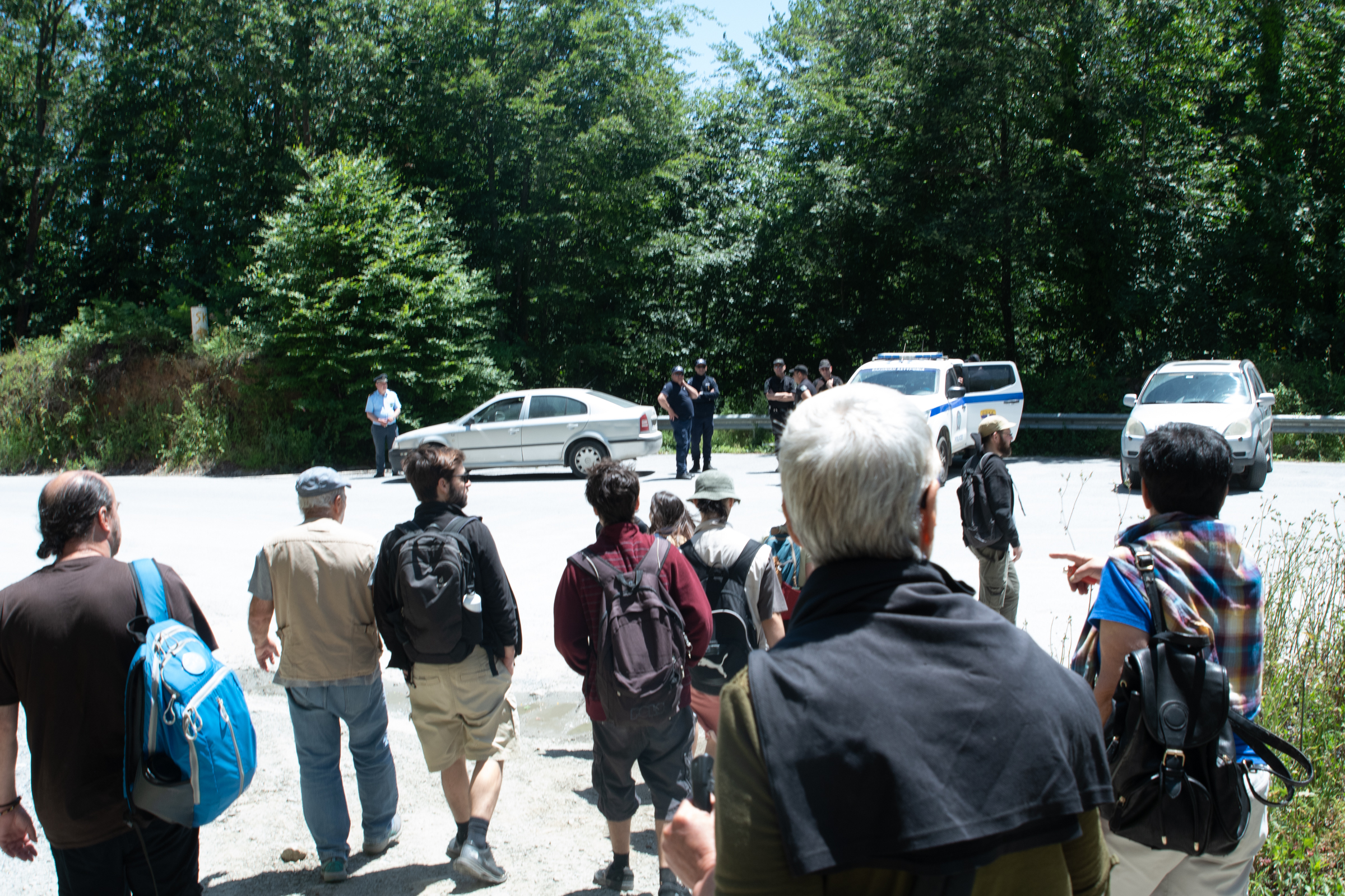 Με αφετηρία την πλατεία της Μεγάλης Παναγίας όπου έγινε μικροφωνική ενημέρωση για τις νέες εξελίξεις και προθέσεις της εταιρείας, στη συνέχεια ξεκίνησε η πορεία κατοίκων της περιοχής και αλληλέγγυων, σε μια διαδρομή εννέα χιλιομέτρων μέσα από γραφικά μονοπάτια γεμάτα καρπούς και ποικιλομορφία χλωρίδας, τα οποία παρά την απαράμιλλη ομορφιά, την επιβλητική φύση και το δέος που προκαλεί το αρχέγονο δάσος των Σκουριών κάθε εποχή, ένιωθε κανείς αβίαστα αυτόν τον σημαντικό πνεύμονα του τόπου μας να αιμορραγεί. Ανάμεσα στα πουλιά και τα θροΐσματα των γιγάντιων δέντρων ακούγονταν εκρήξεις, ανάμεσα στα πεσμένα φύλλα σκοντάφταμε σε εκ νέου τοποθετημένες κορδέλες και πασσάλους που χαράσσουν νέες αποψιλώσεις ολόκληρης πλαγιάς. Καινούριοι φράχτες επεκτείνουν την ήδη ολοκληρωτική καταστροφή, καινούρια οδικά δίκτυα ξεφύτρωσαν ενώ υλοποιούνται ήδη τα επεκτατικά έργα των εγκαταστάσεων. Είδαμε το θηριώδες εργοστάσιο κι αντικρύσαμε μια τεράστια βιομηχανική περιοχή εκεί που κάποτε ήταν παρθένες δασικές διαδρομές. Φτάσαμε στο πλησιέστερο σημείο του open pit για να καταλήξουμε στο χώρο όπου πραγματοποιείται επί σειρά ετών το δεκαήμερο κάμπιγκ ενάντια στις εξορύξεις χρυσού-χαλκού.