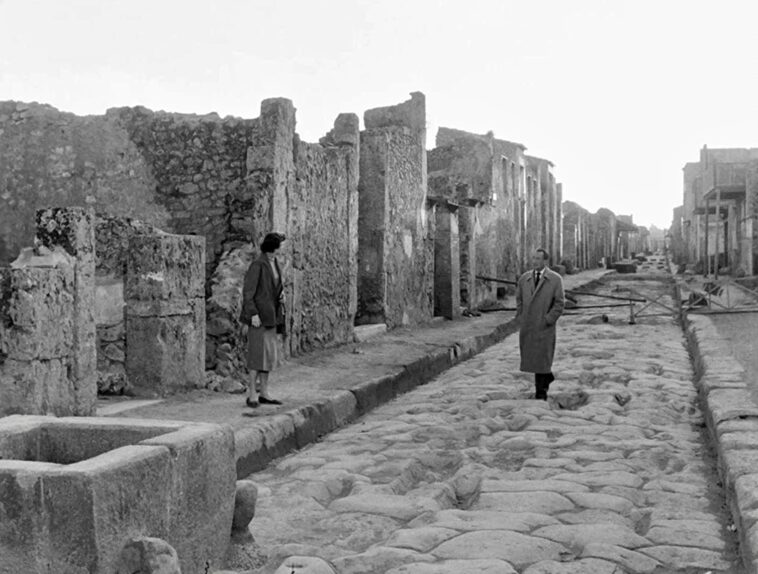 Στο παρακάτω στιγμιότυπο από το Journey to Italy του Roberto Rossellini από το 1954, ο George Sanders και η Ingrid Bergman περιπλανιούνται στα ερείπια της Πομπηίας. Απ’ αυτόν τον σωρό από ερείπια, στο φινάλε της ταινίας, θα αναδυθεί ένα θαύμα – ένα θαύμα που θα ενώσει την συλλογική γιορτή των ανθρώπων με την προσωπική μοίρα των ηρώων. Νωρίτερα, στην πρώτη σκηνή του Journey to Italy, βλέπουμε το ανδρόγυνο μέσα σε ένα αυτοκίνητο, κάπου έξω από τη Νάπολι, να συζητάει: