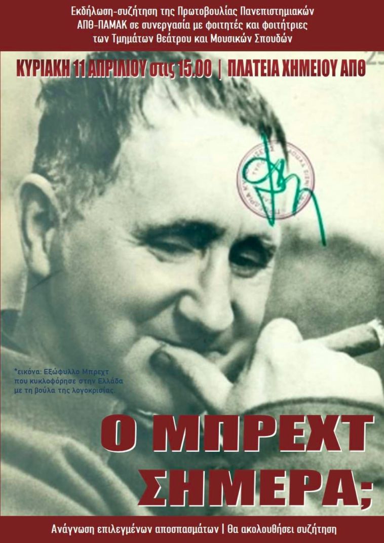 Η Πρωτοβουλία Πανεπιστημιακών ΑΠΘ-ΠΑΜΑΚ, σε συνεργασία με φοιτητές και φοιτήτριες των Τμημάτων Θεάτρου και Μουσικών Σπουδών, καλεί την Κυριακή 11 Απριλίου, στις 15.00, στην πλατεία Χημείου του ΑΠΘ σε εκδήλωση – συζήτηση με θέμα: «Ο Μπρεχτ σήμερα;»