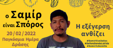Παγκόσμια Ημέρα Δράσης, αύριο 20 Φεβρουαρίου, για τα 3 χρόνια από τη δολοφονία του ιθαγενή αγωνιστή Σαμίρ Φλόρες Σομπεράνες στο Μεξικό. Ο Σαμίρ Φλόρες, μέλος του Μετώπου των Λαών του Μορέλος, της Πουέμπλα και της Τλατσκάλα (FTMPT) και του Εθνικού Ιθαγενικού Κογκρέσου (CNI), δολοφονήθηκε από παραστρατιωτικούς έξω από το σπίτι του στο Αμιλσίνγκο της πολιτείας … Συνεχίστε να διαβάζετε το Ο Σαμίρ είναι Σπόρος-Παγκόσμια Μέρα Δράσης στις 20 Φεβρουαρίου. Περισσότερα