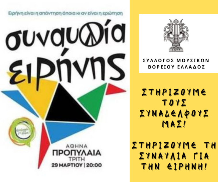«Ο Σύλλογος Μουσικών Βορείου Ελλάδος στηρίζει την πρωτοβουλία της “Αλληλεγγύης για όλους” για την συναυλία Ειρήνης που διοργανώνει.