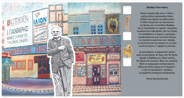Η Ομάδα Γειτονιάς του Βαρδάρη του Προγράμματος Προαγωγής Αυτοβοήθειας «χαρίζει» μια ακόμη τοιχογραφία στον Βαρδάρη σε τοίχο που προβάλει σε υπαίθριο πάρκινγκ, στη συμβολή των οδών Οδυσσέως και Αφροδίτης. Όπως αναφέρεται σε σχετική ανακοίνωση η τοιχογραφία σε μορφή καρτ ποστάλ, αντλεί τη θεματική της από την πρόσφατη ιστορία της περιοχής και την καλλιτεχνική της κληρονομιά. «Συγκεκριμένα, τιμά τον ποιητή Ντίνο Χριστιανόπουλο, που μεγάλο μέρος τόσο του έργου του όσο και της προσωπικής ζωής του είναι συνδεδεμένο με την περιοχή του Βαρδάρη. Η μορφή του μεγάλου θεσσαλονικιού ποιητή πλαισιώνεται από μια σύνθεση έργων του ζωγράφου Ντίνου Παπασπύρου, στα οποία απεικονίζονται δύο από τους εμβληματικότερους κινηματογράφους της περιοχής, το Σινέ Ίλιον και το Πάνθεον καθώς και ο αγαπημένος συνθέτης του ποιητή, Βασίλης Τσιτσάνης. Η σύνθεση συμπληρώνεται με αναφορές στις γάτες που ο Χριστιανόπουλος τόσο αγαπούσε. Φυσικά, από μια τέτοια τοιχογραφία δεν θα μπορούσε να λείπει το ποίημα “Βαρδάρι: Ιλίου Πέρσις” ένα από πιο σπαρακτικά ποιήματα του Χριστιανόπουλου εμπνευσμένο από το θρυλικό “Σινέ Ίλιον”, σημαντικό «σκηνικό» των νυχτερινών του παθών στο Βαρδάρι».