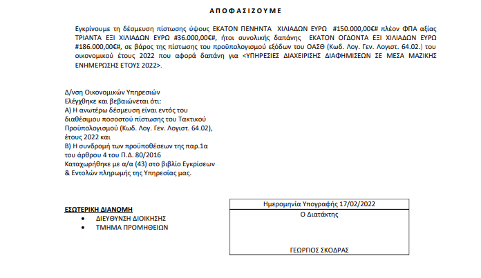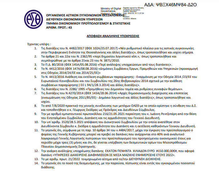 Την ίδια ώρα και ενώ είναι σε καθεστώς εκκαθάρισης, ο ΟΑΣΘ έχει τα χρήματα για να προχωρήσει σε δαπάνες 150.000 ευρώ (!) για την παροχή υπηρεσιών διαχείρισης διαφημίσεων σε μέσα μαζικής ενημέρωσης για το έτος 2022.