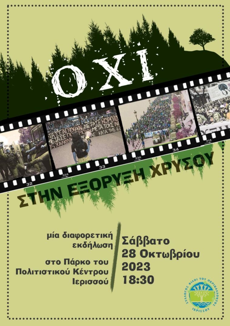 Ο Σύλλογος «Φίλοι του Περιβάλλοντος Ιερισσού» μαζί με συλλόγους και φορείς της περιοχής διοργανώνουν το Σάββατο 28-10-2023 στο πάρκο του Αριστοτελείου Πνευματικού Κέντρου Ιερισσού, μια διαφορετική εκδήλωση. Στόχος της, όπως αναφέρεται σε σχετική ανακοίνωση, είναι η συσπείρωση του κόσμου ενάντια στην αλόγιστη εξόρυξη στην ΒΑ Χαλκιδική.