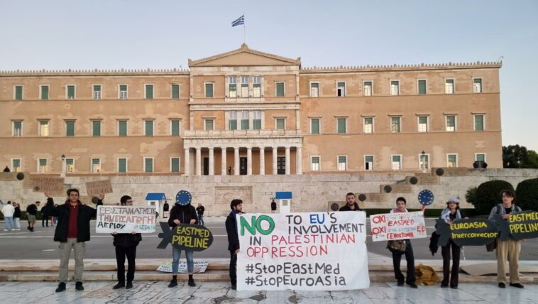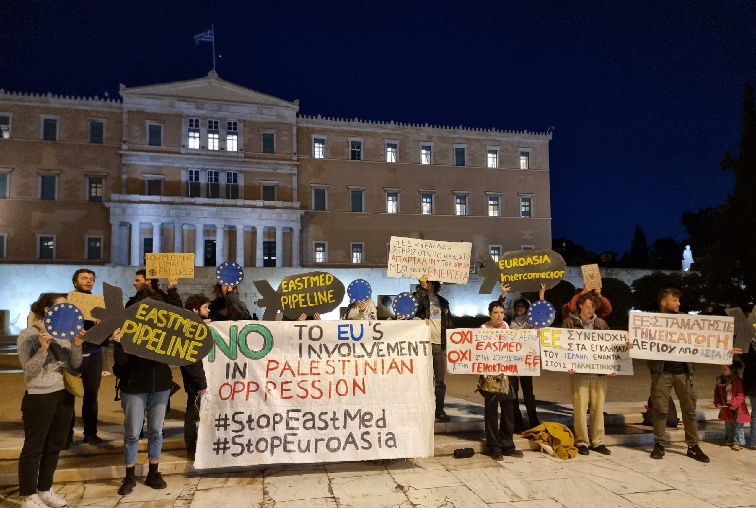 Παρέμβαση έξω από τη Βουλή πραγματοποίησαν ακτιβιστές/στριες απαιτώντας να μπει ένα τέλος στην υποστήριξη που παρέχει η ΕΕ (και η Ελλάδα) στα ορυκτά καύσιμα και τον αγωγό EastMed, αναδεικνύοντας, μεταξύ άλλων, τη συνενοχή της ΕΕ και της χώρας μας στη συνεχιζόμενη βία ενάντια στον Παλαιστινιακό λαό. Όπως τονίζουν σε ανακοίνωσή τους «εν μέσω των αποτρόπαιων επιθέσεων στη Γάζα, ο αγωγός EastMed φιγουράρει και πάλι μεταξύ των έργων “προτεραιότητας” της ΕΕ για να λάβει χρηματοδοτήσεις».