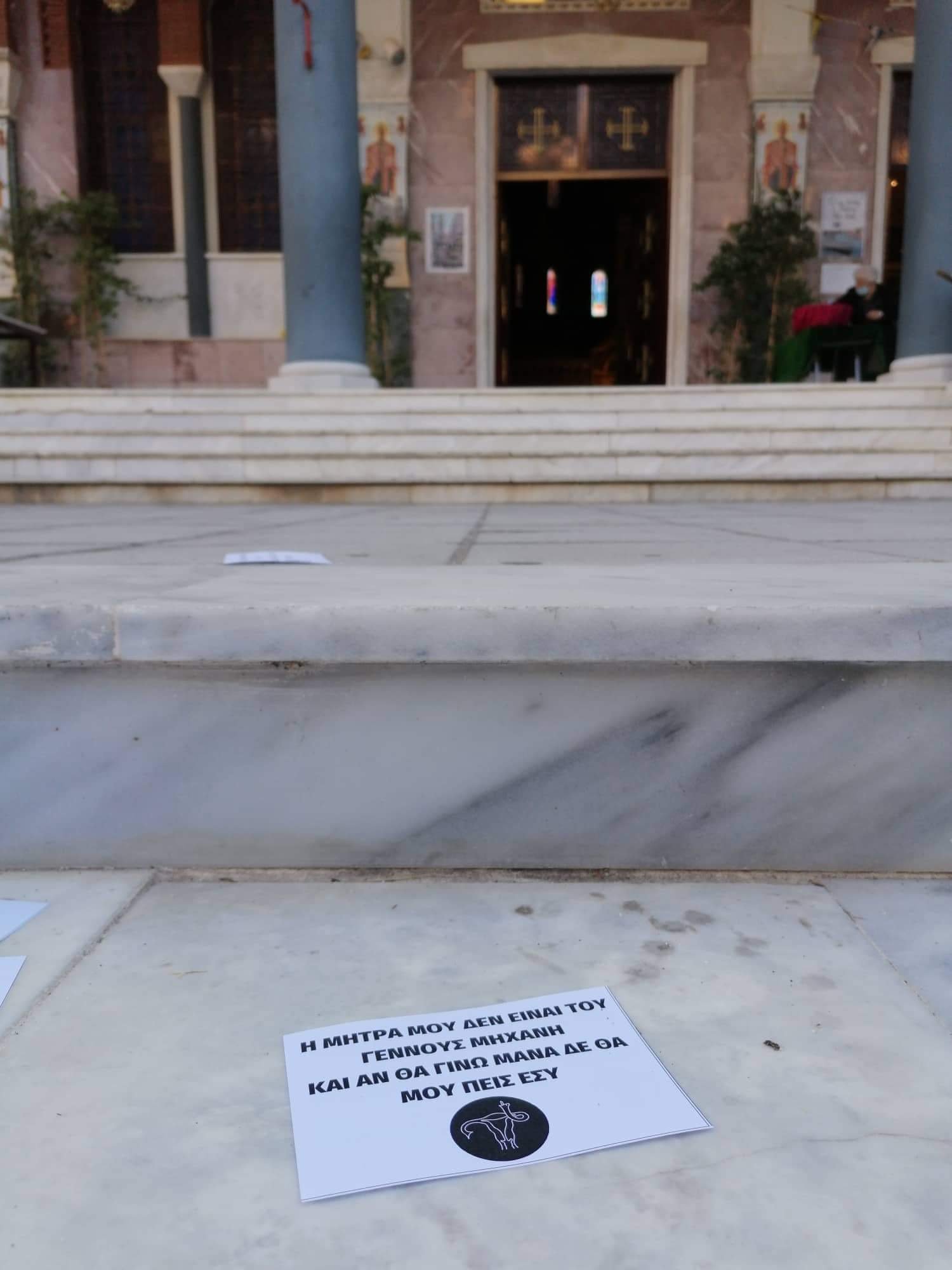 Διαμαρτυρία κατά των σκοταδιστικών κηρυγμάτων της Εκκλησίας της Ελλάδος μέσω των οποίων στρέφεται ενάντια στο νομικά κατοχυρωμένο δικαίωμα στην άμβλωση πραγματοποίησαν μέλη της φεμινιστικής συλλογικότητας ΦΥΛ.Ι.Σ auth έξω από την Παναγία Δέξια.