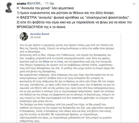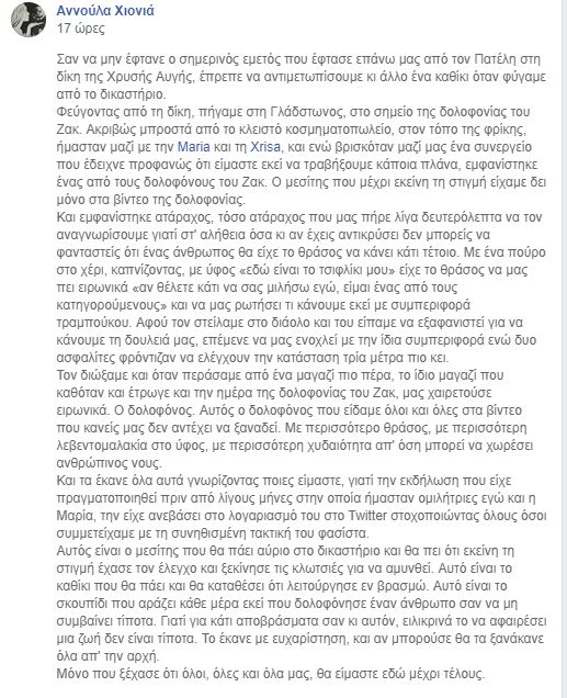 Σαν να μην έφτανε ο σημερινός εμετός που έφτασε επάνω μας από τον Πατέλη στη δίκη της Χρυσής Αυγής, έπρεπε να αντιμετωπίσουμε κι άλλο ένα καθίκι όταν φύγαμε από το δικαστήριο. Φεύγοντας από τη δίκη, πήγαμε στη Γλάδστωνος, στο σημείο της δολοφονίας του Ζακ. Ακριβώς μπροστά από το κλειστό κοσμηματοπωλείο, στον τόπο της φρίκης, ήμασταν μαζί με την Maria και τη Xrisa, και ενώ βρισκόταν μαζί μας ένα συνεργείo που έδειχνε προφανώς ότι είμαστε εκεί να τραβήξουμε κάποια πλάνα, εμφανίστηκε ένας από τους δολοφόνους του Ζακ. Ο μεσίτης που μέχρι εκείνη τη στιγμή είχαμε δει μόνο στα βίντεο της δολοφονίας. Και εμφανίστηκε ατάραχος, τόσο ατάραχος που μας πήρε λίγα δευτερόλεπτα να τον αναγνωρίσουμε γιατί στ’ αλήθεια όσα κι αν έχεις αντικρύσει δεν μπορείς να φανταστείς ότι ένας άνθρωπος θα είχε το θράσος να κάνει κάτι τέτοιο. Με ένα πούρο στο χέρι, καπνίζοντας, με ύφος «εδώ είναι το τσιφλίκι μου» είχε το θράσος να μας πει ειρωνικά «αν θέλετε κάτι να σας μιλήσω εγώ, είμαι ένας από τους κατηγορούμενους» και να μας ρωτήσει τι κάνουμε εκεί με συμπεριφορά τραμπούκου. Αφού τον στείλαμε στο διάολο και του είπαμε να εξαφανιστεί για να κάνουμε τη δουλειά μας, επέμενε να μας ενοχλεί με την ίδια συμπεριφορά ενώ δυο ασφαλίτες φρόντιζαν να ελέγχουν την κατάσταση τρία μέτρα πιο κει. Toν διώξαμε και όταν περάσαμε από ένα μαγαζί πιο πέρα, το ίδιο μαγαζί που καθόταν και έτρωγε και την ημέρα της δολοφονίας του Ζακ, μας χαιρετούσε ειρωνικά. Ο δολοφόνος. Αυτός ο δολοφόνος που είδαμε όλοι και όλες στα βίντεο που κανείς μας δεν αντέχει να ξαναδεί. Με περισσότερο θράσος, με περισσότερη λεβεντομαλακία στο ύφος, με περισσότερη χυδαιότητα απ’ όση μπορεί να χωρέσει ανθρώπινος νους.