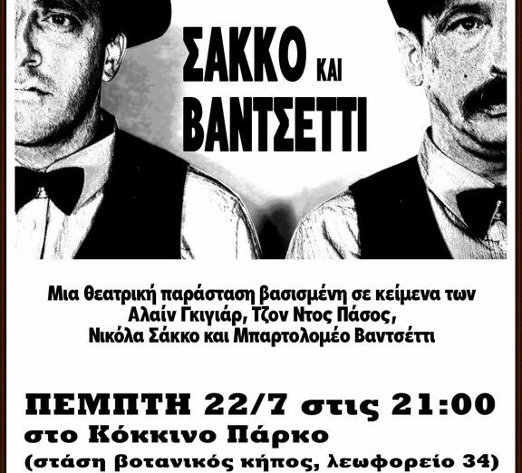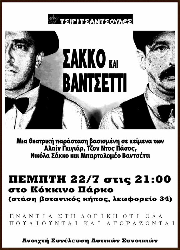 Σήμερα, Πέμπτη 22 Ιουλίου στις 21.00 στο Κόκκινο Πάρκο στην Άνω Ηλιούπολη, η Ανοιχτή Συνέλευση Δυτικών Συνοικιών και οι Τσιριτσάντσουλες παρουσιάζουν: Σάκκο και Βαντσέττι, μια θεατρική παράσταση βασισμένη σε κείμενα των Αλαίν Γκιγιάρ, Τζον Ντος Πάσος, Νικόλα Σάκκο και Μπαρτολομέο Βαντσέττι.