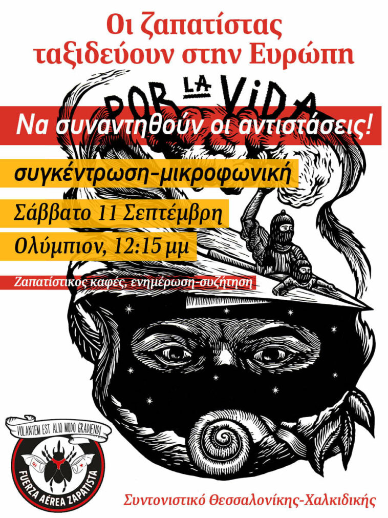 Μικροφωνική συγκέντρωση ενημέρωσης σχετικά με το Ταξίδι για τη Ζωή διοργανώνει το «Συντονιστικό Θεσσαλονίκης – Χαλκιδικής για την υποδοχή των ζαπατίστας» στις 12:15 το μεσημέρι, έξω από το Ολύμπιον.