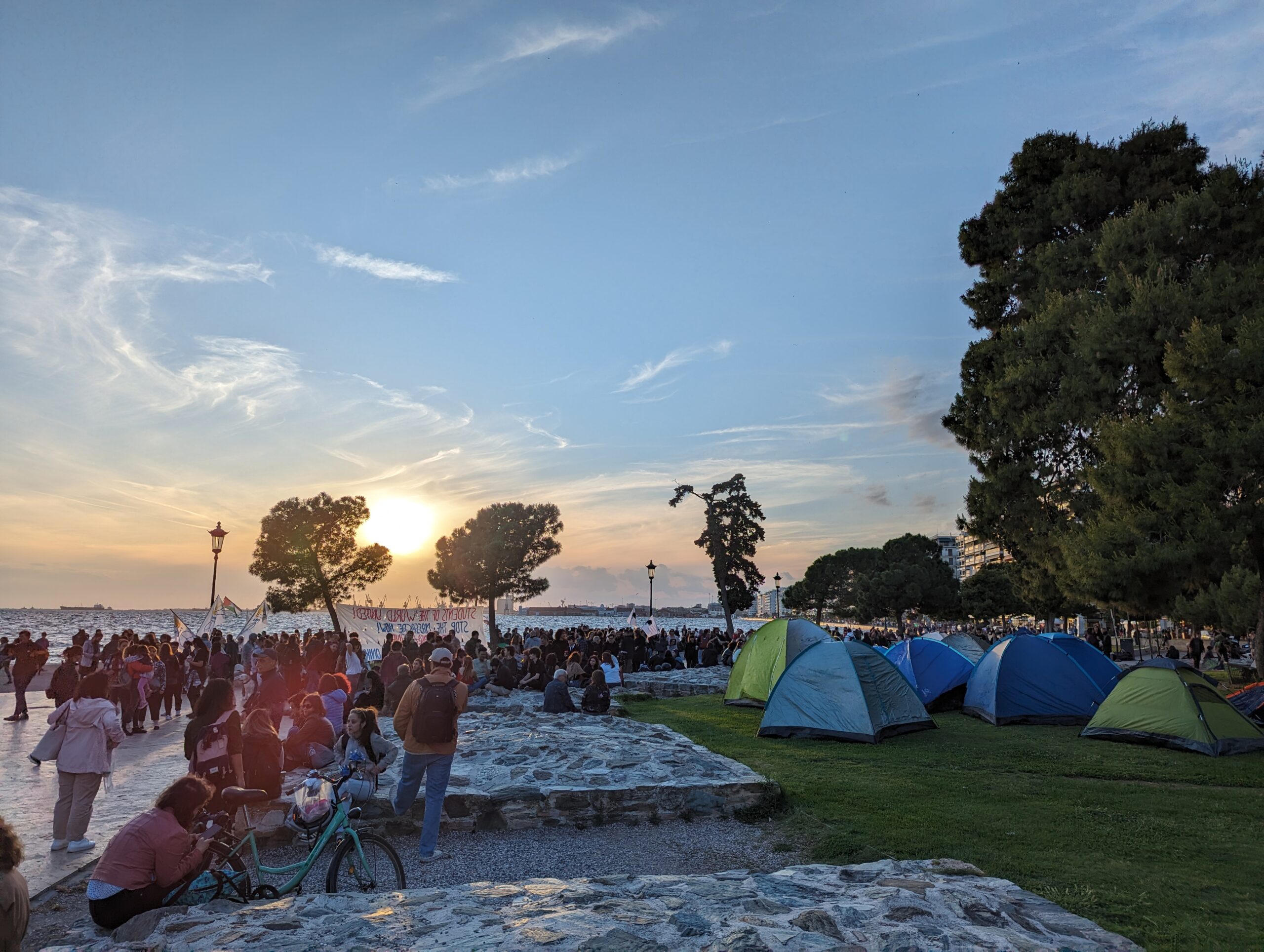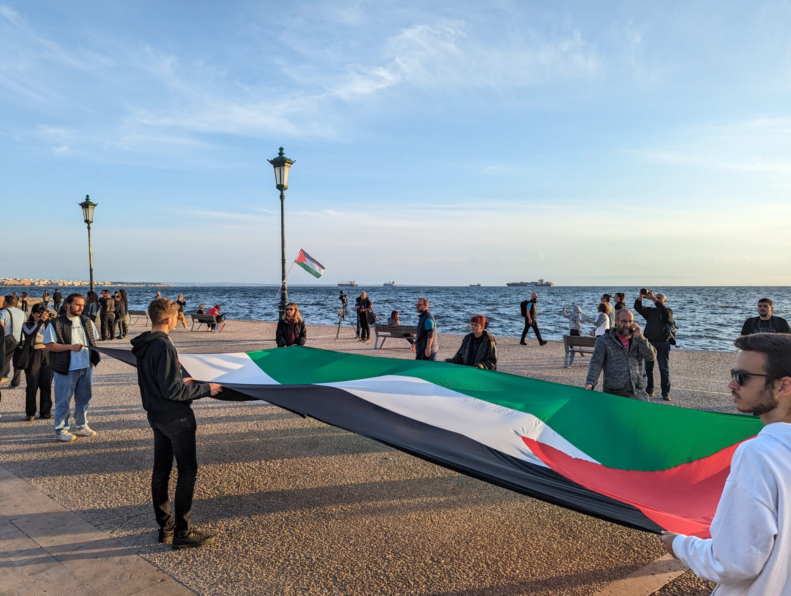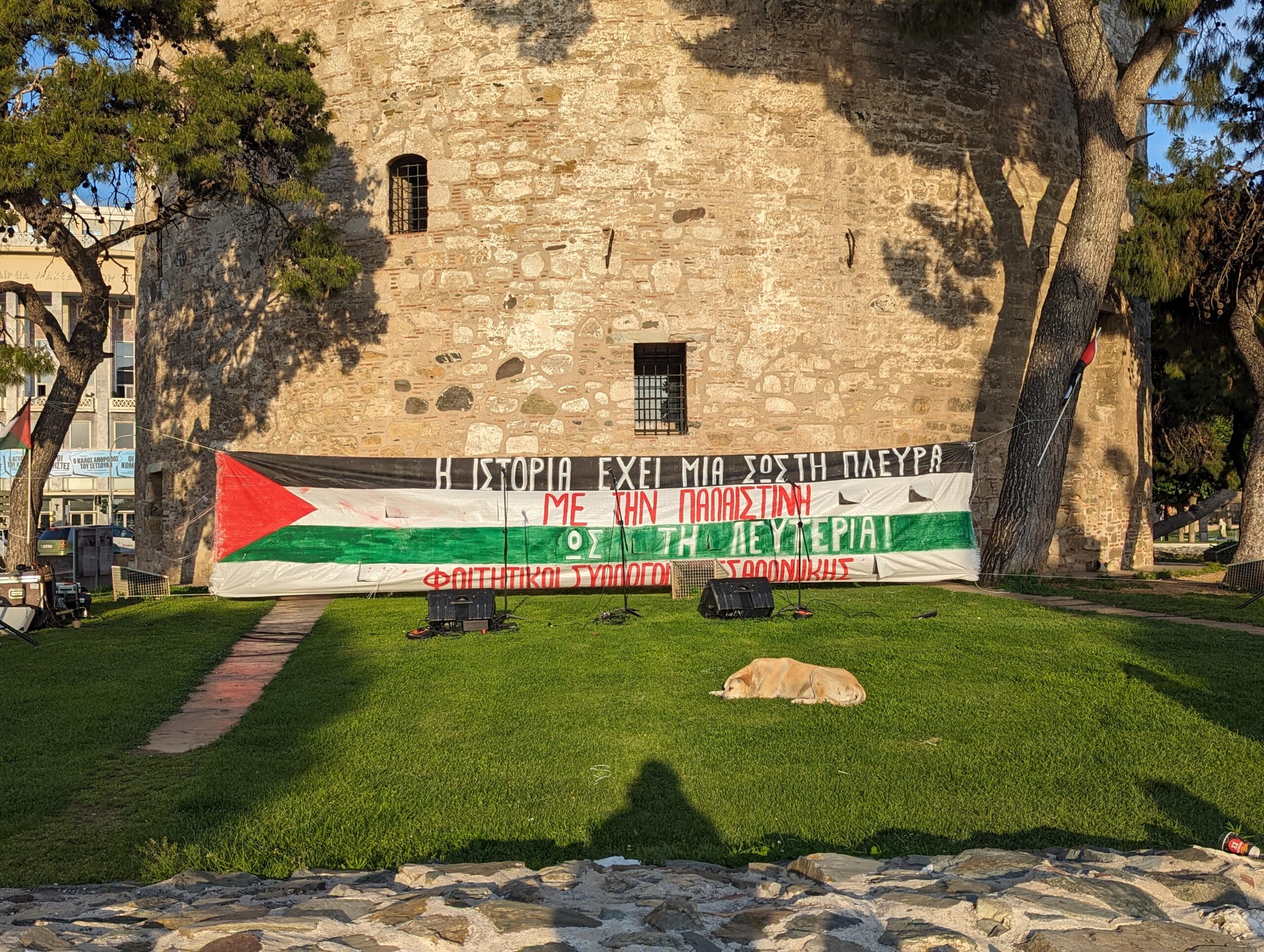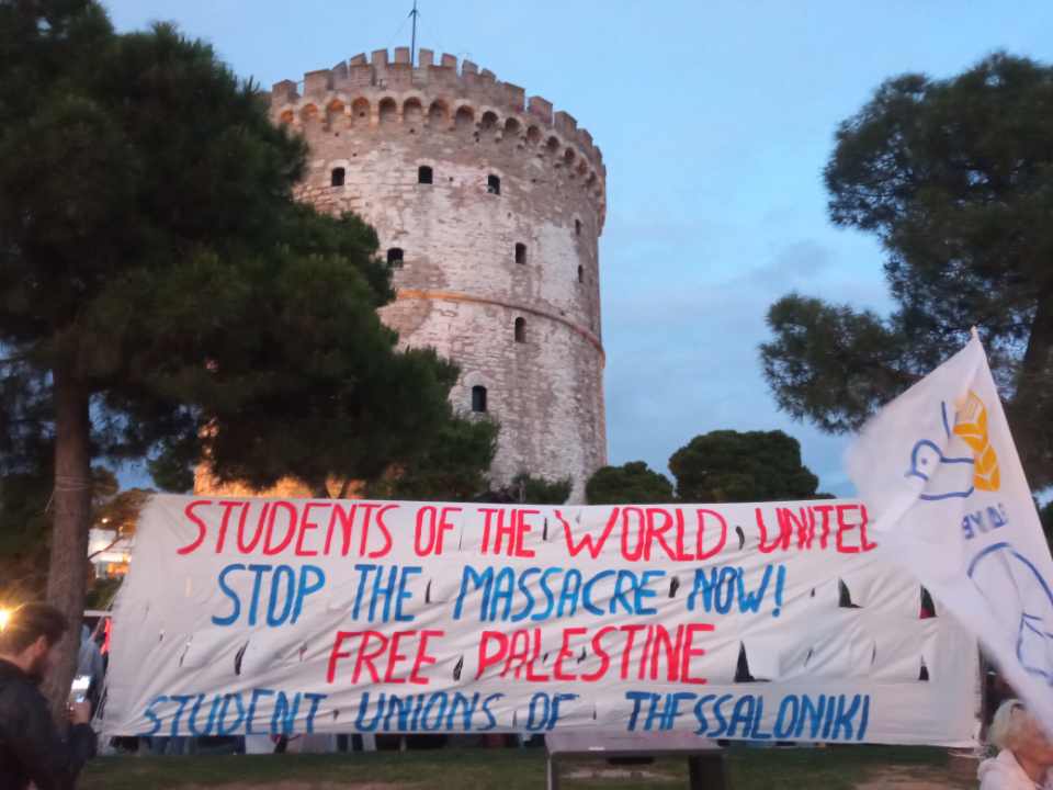 Με κεντρικό σύνθημα “Η ιστορία έχει μια σωστή πλευρά, με την Παλαιστίνη ως τη λευτεριά” πραγματοποιήθηκε το βράδυ της Δευτέρας ολονύχτια συγκέντρωση διαμαρτυρίας στην πλατεία του Λευκού Πύργου κατά του πολέμου στη Γάζα από Φοιτητικούς Συλλόγους και Σωματεία Εργαζομένων της Θεσσαλονίκης.