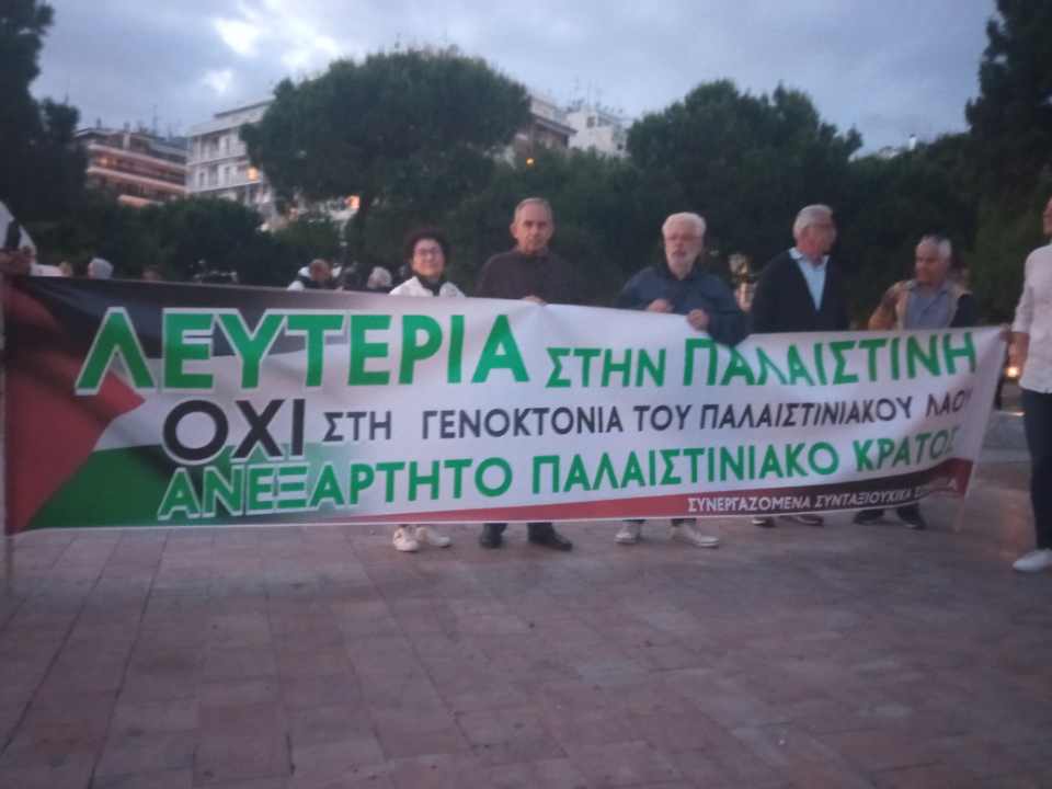 Με κεντρικό σύνθημα “Η ιστορία έχει μια σωστή πλευρά, με την Παλαιστίνη ως τη λευτεριά” πραγματοποιήθηκε το βράδυ της Δευτέρας ολονύχτια συγκέντρωση διαμαρτυρίας στην πλατεία του Λευκού Πύργου κατά του πολέμου στη Γάζα από Φοιτητικούς Συλλόγους και Σωματεία Εργαζομένων της Θεσσαλονίκης.