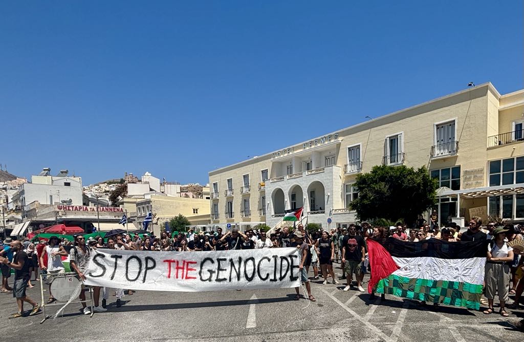 Μετά από μια μαζική διαμαρτυρία όπου κάτοικοι της Σύρου κρατούσαν μια γιγαντιαία παλαιστινιακή σημαία και φωνάζοντας συνθήματα αλληλεγγύης στον Παλαιστινιακό λαό, το ισραηλινό κρουαζιερόπλοιο αναχώρησε χωρίς να κατέβουν οι επιβάτες.