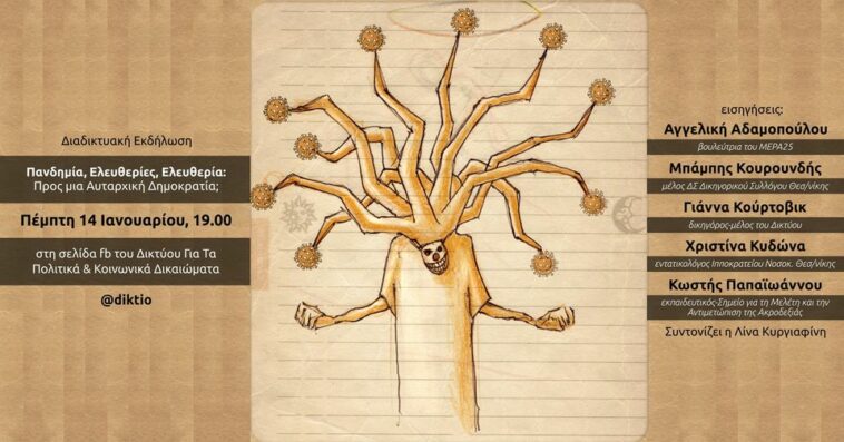 Την Πέμπτη 14 Ιανουαρίου, στις 7:00μμ, το Δίκτυο για τα Πολιτικά και Κοινωνικά Δικαιώματα οργανώνει διαδικτυακή εκδήλωση με τίτλο «Πανδημία, Ελευθερίες, Ελευθερία: Προς μια Αυταρχική Δημοκρατία;»