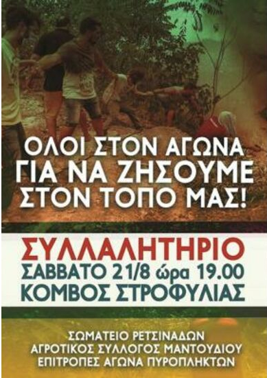 Πανευβοϊκό συλλαλητήριο διοργανώνουν στις 21 Αυγούστου τα σωματεία ρητινοκαλλιεργητών-δασεργατών Ευβοίας, ο αγροτικός σύλλογος Μαντουδίου-Λίμνης-Αγίας Άννας και οι επιτροπές αγώνα των πυρόπληκτων απαιτώντας την αποκατάσταση όλων των ζημιών που προκλήθηκαν από τις πυρκαγιές στα χωριά τους. Τα σωματεία και οι επιτροπές κατοίκων καταγγέλλουν την κυβέρνηση για την καταστροφή που υπέστησαν οι κάτοικοι της Β. Εύβοιας τονίζοντας ότι «μας άφησαν στο έλεος και μας έκαψαν» . Στο συλλαλητήριο καλούν ακόμη πλήθος συλλογικοτήτων και συλλόγων όλων των πυρόπληκτων χωριών καθώς και αλληλέγγυες οργανώσεις απ’όλη την Ελλάδα.