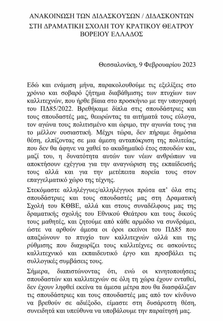 Την παραίτησή τους ανακοίνωσαν πριν λίγα λεπτά οι καθηγήτριες και οι καθηγητές της Ανώτερης Σχολής Δραματικής Σχολής του Κρατικού Θεάτρου Βορείου Ελλάδος σε ένδειξη αλληλεγγύης πρώτα απ’όλα στις σπουδάστριες και τους σπουδαστές στη Δραματική Σχολή του ΚΘΒΕ αλλά και στους συναδέλφους της δραματικής σχολής του Εθνικού Θεάτρου και τους δικούς τους μαθητές. Ζητούν από κάθε αρμόδιο να συνδράμει ώστε να αρθούν άμεσα οι όροι εκείνοι του ΠΔ85 που απαξιώνουν το πτυχίο των καλλιτεχνών αλλά και της ρύθμισης που διαχωρίζει τους καλλιτέχνες σε ασκούντες καλλιτεχνικό και εκπαιδευτικό έργο και προσβάλει τις συλλογικές συμβάσεις τους.