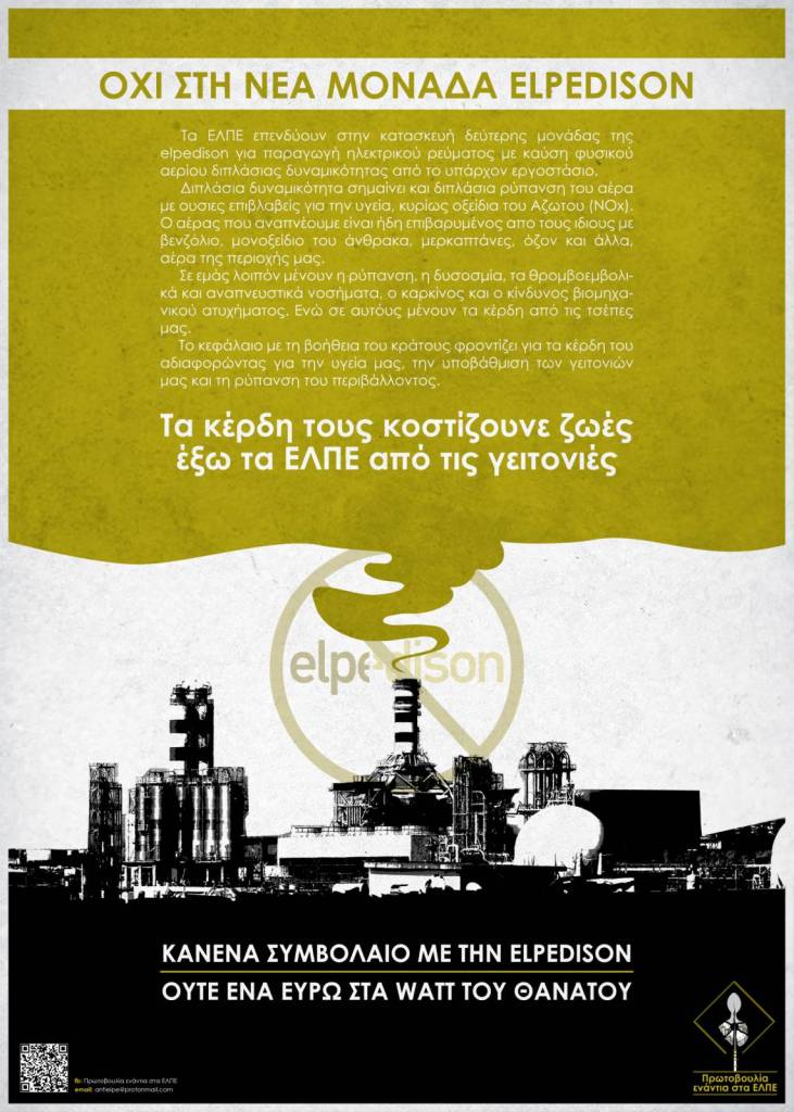 «Το ρεύμα της Elpedison παράγεται από την επιβάρυνση των ζωών μας. Οι αρρώστιες μας είναι τα κέρδη τους. Όταν το αίτημά μας μετά από τόσα χρόνια άλυτων προβλημάτων είναι να φύγουν τα ΕΛΠΕ, είναι αυτονόητο πως δεν πρέπει να αφήσουμε κανένα νέο φουγάρο να φυτευτεί κοντά μας. Ούτε τούβλο να μη βάλουν. Ο μόνος δρόμος για αυτούς είναι μακριά από τις γειτονιές μας. Δεν χρηματοδοτούμε τους θανάτους μας. Ακύρωση- Απόρριψη συμβολαίων με την Elpedison».