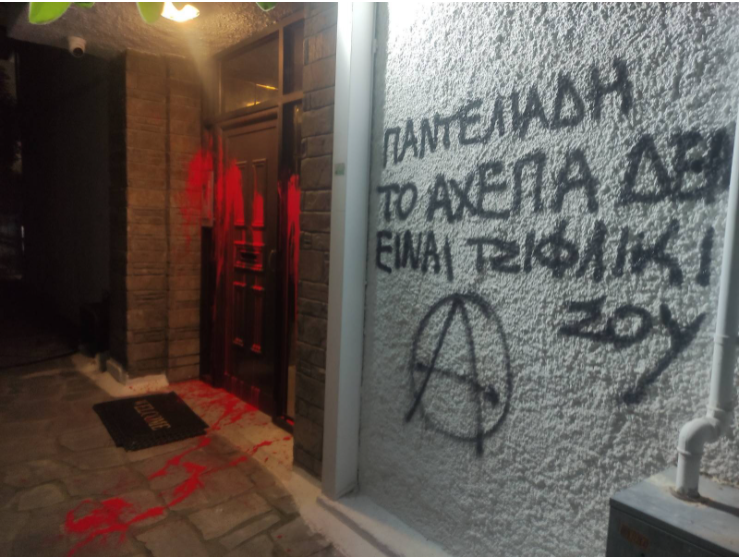 Το σύνθημα «Παντελιάδη το ΑΧΕΠΑ δεν είναι τσιφλίκι σου» έγραψαν με σπρέι στην είσοδο της πολυκατοικίας του διοικητή του ΑΧΕΠΑ, Παναγιώτη Παντελιάδη, μέλη της Ελευθεριακής Πρωτοβουλίας Θεσσαλονίκης μετά το έγγραφο του διοικητή που κάνει λόγο για εισαγωγή ασθενών στο νοσοκομείο μόνο με έγκριση της διοίκησης, ενώ πέταξαν και κόκκινα χρώματα στους τοίχους και την πόρτα της πολυκατοικίας που διαμένει.