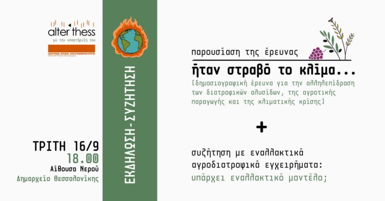 Ερωτήματα σαν αυτά, που φέρνουν το ζήτημα της κλιματικής δικαιοσύνης… στο πιάτο μας, θέτει η πολύμηνη πολυμεσική έρευνα του ανεξάρτητου συνεργατικού μέσου Alterthess «Ήταν στραβό το κλίμα…», σχετικά με την αλληλεπίδραση των διατροφικών αλυσίδων, της αγροτικής παραγωγής και της κλιματικής κρίσης. Η έρευνα πραγματοποιήθηκε με την υποστήριξη του Ιδρύματος Ρόζα Λούξεμπουργκ – Παράρτημα Ελλάδας.