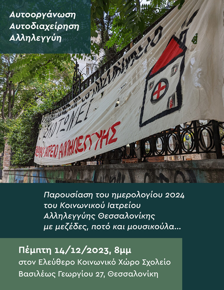 Το Κοινωνικό Ιατρείο Αλληλεγγύης Θεσσαλονίκης καλεί στην παρουσίαση του ημερολογίου του για το 2024, με μεζέδες, ποτό και μουσικούλα, την Πέμπτη 14 Δεκεμβρίου 2023 – ώρα 8μμ, στον Ελεύθερο Κοινωνικό Χώρο Σχολείο (Βασιλέως Γεωργίου 27, Θεσσαλονίκη).