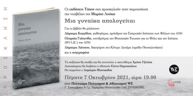 Στην παρουσίαση της νουβέλας της Μαρίας Λούκα «Μια γυναίκα απολογείται» προσκαλούν την Πέμπτη 7 Οκτωβρίου 2021 οι εκδόσεις Τόπος. Η παρουσίαση θα γίνει στις 7 μ.μ. στον πολυχώρο πολιτισμού και αθλητισμού WE.