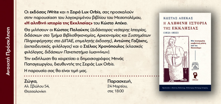 Η παρουσίαση του λογοκριμένου βιβλίου του Μεσοπολέμου «Η αληθινή ιστορία της Εκκλησίας» του Κώστα Απέκα διοργανώνεται την Παρασκευή 24 Μαρτίου, στις 6:00 το απόγευμα, στο Καφέ Ζώγια, (Σβώλου 54) από τις εκδόσεις iWrite και τη Σειρά Lux Orbis.