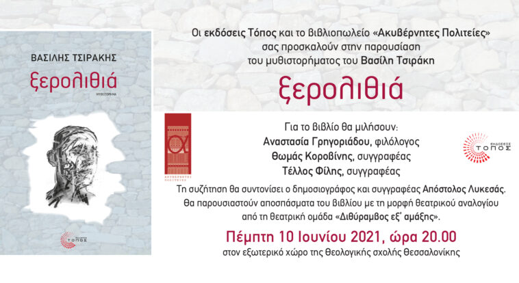 Οι εκδόσεις «Τόπος» και το βιβλιοπωλείο «Ακυβέρνητες Πολιτείες» διοργανώνουν εκδήλωση παρουσίασης του μυθιστορήματος του Βασίλη Τσιράκη «Ξερολιθιά», την Πέμπτη 10 Ιουνίου στις 20.00 στον εξωτερικό χώρο της Θεολογικής Σχολής.