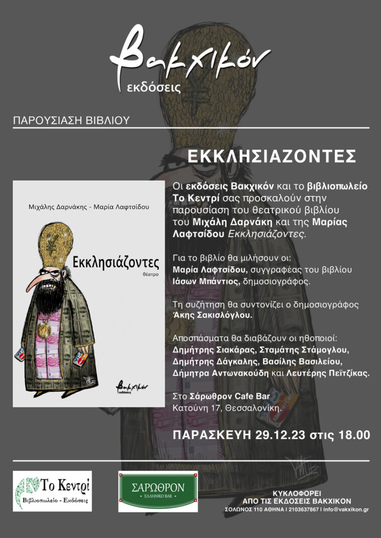Οι εκδόσεις Βακχικόν και το βιβλιοπωλείο Το Κεντρί διοργανώνουν παρουσίαση του θεατρικού βιβλίου του Μιχάλη Δαρνάκη και της Μαρίας Λαφτσίδου Εκκλησιάζοντες, την Παρασκευή 29 Δεκεμβρίου 2024, στις 18.00, στο Σάρωθρον Cafe Bar (Κατούνη 17, Θεσσαλονίκη).