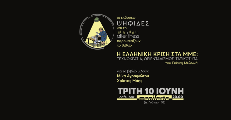 Οι εκδόσεις Ψηφίδες και η στήλη του Alterthess, Alter-Βιβλίο παρουσιάζουν στη Θεσσαλονίκη το βιβλίο «Η ελληνική κρίση στα ΜΜΕ. Τεχνοκρατία, οριενταλισμός, ταξικότητα» του Γιάννη Μυλωνά, την Τρίτη 10 Ιουνίου στις 20:00, στο cafe-bar Manifesto (Δημ. Γούναρη 51).