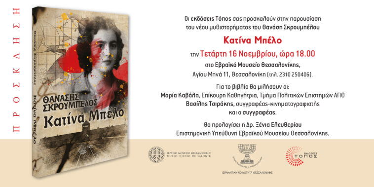 Την Τετάρτη 16 Νοεμβρίου και ώρα 18:00 θα γίνει η παρουσίαση του μυθιστορήματος του Θ. Σκρουμπέλου, Κατίνα Μπέλο από τις εκδόσεις Τόπος, στο Εβραϊκό Μουσείο Θεσσαλονίκης (Αγίου Μηνά 11)