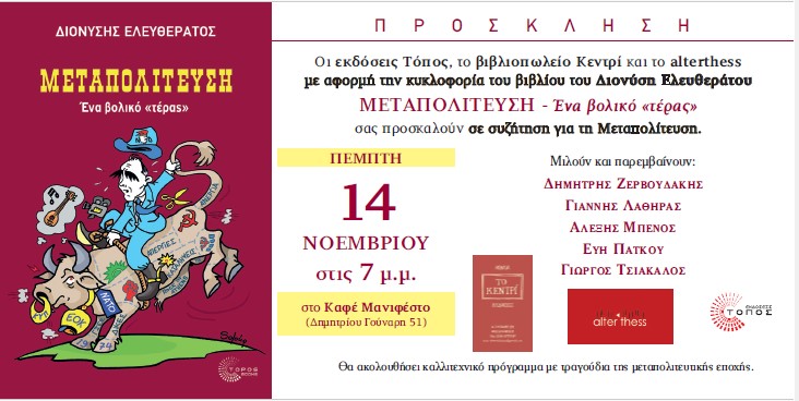 Οι εκδόσεις Τόπος, το βιβλιοπωλείο Κεντρί, και το alterthess με αφορμή την κυκλοφορία του βιβλίου του Διονύση Ελευθεράτου «Μεταπολίτευση-Ένα βολικό “τέρας”» διοργανώνουν την Πέμπτη 14 Νοεμβρίου και στις 7 μ.μ. συζήτηση για τη Μεταπολίτευση στο καφέ Μανιφέστο (Δημητρίου Γούναρη 51)