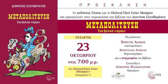 Οι εκδόσεις Τόπος και το ΠολιτιΣΤΙκό Στέκι Μπάρκο (Γκαρμπολά 7) διοργανώνουν την παρουσίαση του βιβλίου του Διονύση Ελευθεράτου «Μεταπολίτευση, ένα βολικό τέρας», στις 23 Οκτωβρίου στις 7 μ.μ.