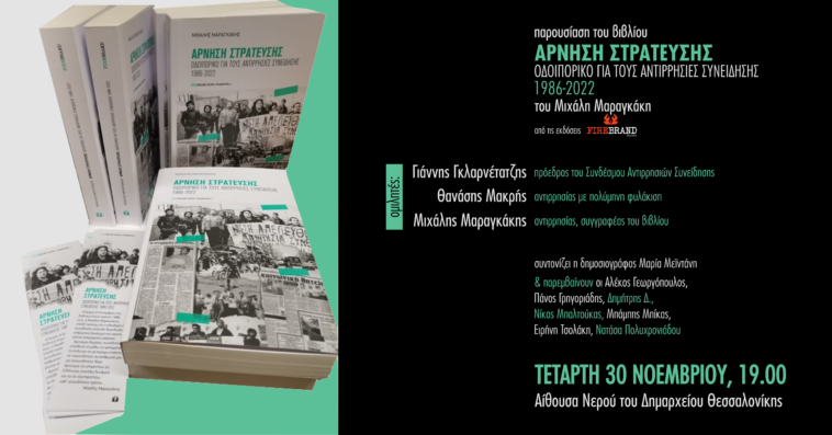 Ο Σύνδεσμος Αντιρρησιών Συνείδησης και οι εκδόσεις Firebrand καλούν στην παρουσίαση του καινούργιου βιβλίου του Μιχάλη Μαραγκάκη την Τετάρτη 30 Νοεμβρίου 7 μ.μ., Αίθουσα νερού Δημαρχείο Θεσσαλονίκης.