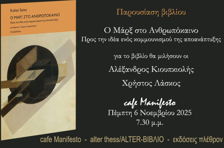Το cafe Manifesto (Γούναρη 51), το alter-βιβλίο και οι εκδόσεις Πλέθρον διοργανώνουν την Πέμπτη 6 Νοεμβρίου και ώρα 19:30 παρουσίαση του βιβλίου «Ο Μάρξ στο Ανθρωπόκαινο-Προς την ιδέα ενός κομμουνισμού της αποανάπτυξης»