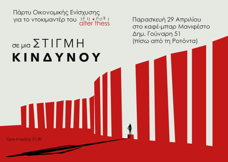 Η ΚΟΙΝΣΕΠ του Alterthess διοργανώνει πάρτι οικονομικής ενίσχυσης για την κάλυψη μέρους των εξόδων του ντοκιμαντέρ «Σε μια στιγμή κινδύνου», την Παρασκευή 29 Απριλίου στο καφέ-μπαρ Μανιφέστο (Δημ. Γούναρη 51, πίσω από τη Ροτόντα), με ώρα έναρξης στις 21:30.