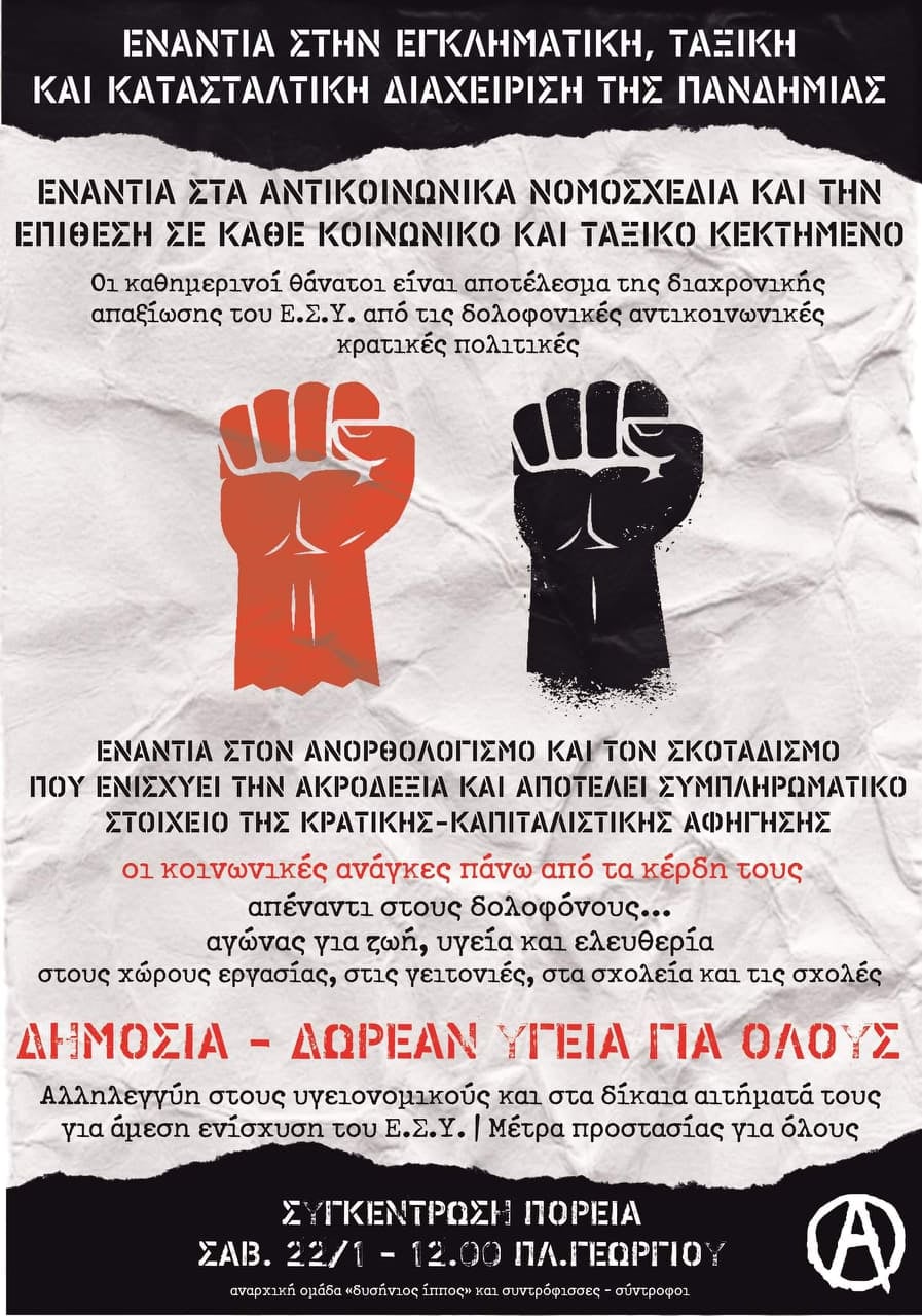 «Η εγκληματική κρατική διαχείριση της πανδημίας αφήνει πίσω της καθημερινά δεκάδες ή και εκατοντάδες νεκρούς και το Ε.Σ.Υ. διαλυμένο και υποστελεχωμένο. Από την πρώτη στιγμή της πανδημίας το κράτος δεν πήρε κανένα ουσιαστικό μέτρο για την προστασία της δημόσιας υγείας παρά μόνο κατασταλτικά μέτρα και μέτρα προστασίας και ενίσχυσης της κερδοφορίας του κεφαλαίου.
