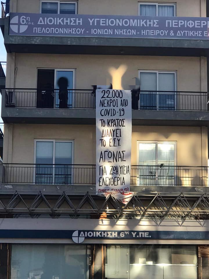 Παρέμβαση με πανό, τρικάκια και μοίρασμα κειμένων στα πλαίσια των δράσεων ενόψει της πανελλαδικής ημέρας για την υπεράσπιση της Δημόσιας Υγείας το Σάββατο 22 Ιανουαρίου, πραγματοποίησαν σήμερα μέλη της αναρχικής ομάδας «Δυσήνιος Ίππος» μαζί με άλλα άτομα του αντιεξουσιαστικού χώρου στην 6η ΥΠΕ Πελοποννήσου-Ιονίων Νήσων-Ηπείρου και Δυτικής Ελλάδας. Χωρίς να έχει δημιουργηθεί το παραμικρό επεισόδιο αστυνομικοί έφτασαν στο σημείο και προσήγαγαν τα άτομα που πραγματοποίησαν την παρέμβαση αντιπληροφόρησης.
