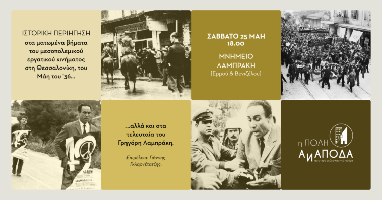 Η δημοτική κίνηση του δήμου Θεσσαλονίκης Πόλη Ανάποδα διοργανώνει το Σάββατο 25 Μαΐου, στις 18:00, περιήγηση, “από τα ματωμένα βήματα των εργατών τον Μάη του ’36, ως τα τελευταία βήματα του Γρηγόρη Λαμπράκη”.