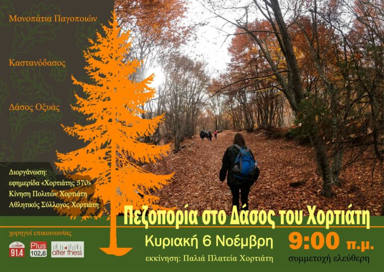 Πεζοπορία στο δάσος του Χορτιάτη διοργανώνουν για ακόμη μια χρονιά η εφημερίδα «Χορτιάτης 570», η Κίνηση Πολιτών Χορτιάτη και ο Αθλητικός Σύλλογος Χορτιάτη, την Κυριακή 6 Νοέμβρη.