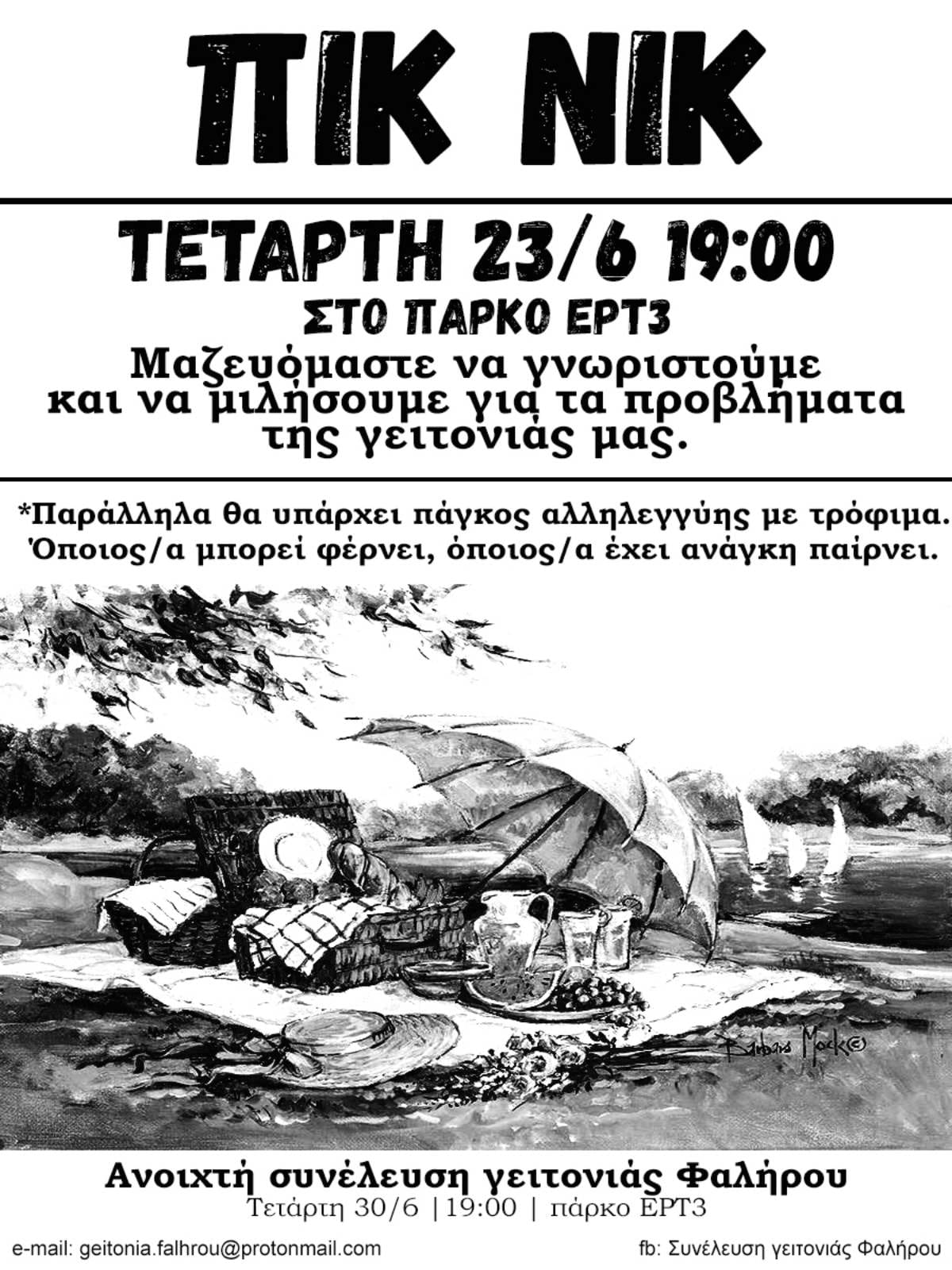 Πικ νικ έχει προγραμματιστεί για σήμερα, Τετάρτη 23 Ιουνίου στις 19.00 στο πάρκο «Πεδίον του Άρεως» απέναντι από την ΕΡΤ3, από την Συνέλευση Γειτονιάς Φαλήρου «για συζήτηση και ανταλλαγή απόψεων γύρω από τα κοινά μας προβλήματα». «Παράλληλα με το πικ νικ θα υπάρχει και πάγκος αλληλεγγύης για τους γείτονες που έχουν ανάγκη» αναφέρεται στη σχετική ανακοίνωση, ενώ επόμενη ανοιχτή συνέλευση θα πραγματοποιηθεί την επόμενη Τετάρτη 30/6 στις 19.00 και πάλι στο ίδιο μέρος.