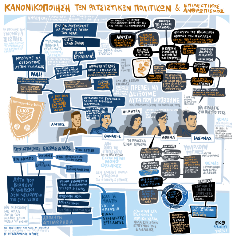 Στην εκδήλωση συμμετείχαν ο Ιάσονας Αποστολόπουλος (διασώστης), η Αθηνά Καλογρίδη,(δικηγόρος-μέλος της Equal Legal Aid), ο Θανάσης Καμπαγιάννης (μέλος της Εναλλακτικής Πρωτοβουλίας Δικηγόρων) και ο Αλέξης Τριανταφυλλίδης (κοινωνικός λειτουργός) προσπαθώντας να σπάσουν την επιχειρούμενη συγκάλυψη των κυβερνητικών ευθυνών για το έγκλημα της Πύλου, να αναδείξουν την παγίωση των pushback ως την αιτία που οδηγεί στην απώλεια ανθρώπινων ζωών, ενώ παράλληλα μίλησαν για διαχρονικές πτυχές των ρατσιστικών πολιτικών του ελληνικού κράτους και της «Ευρώπης-φρούριο» εντός και εκτός των τειχών.