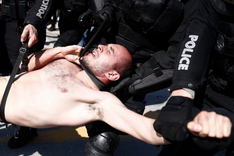 Αστυνομικός τραβάει θηλιά σε προσαχθέντα διαδηλωτή τον οποίο έχουν προηγουμένως χτυπήσει άγρια τα ΜΑΤ μετά την εισβολή τους στο ΑΠΘ.