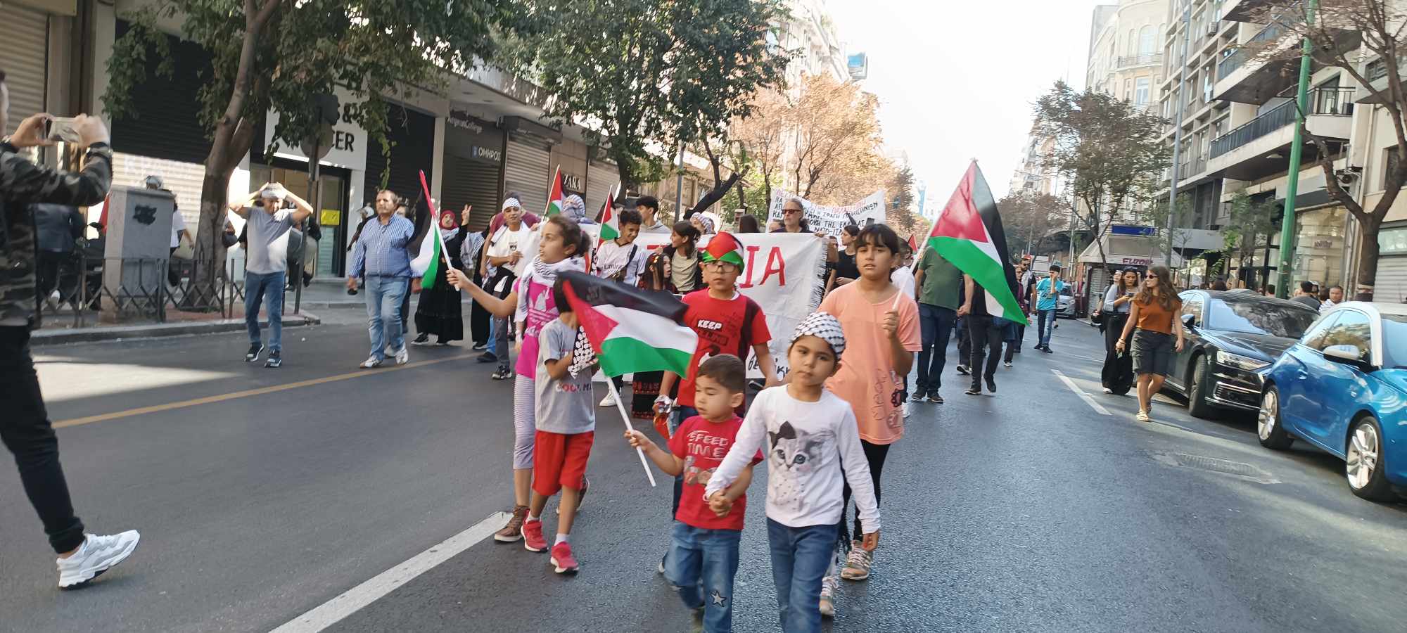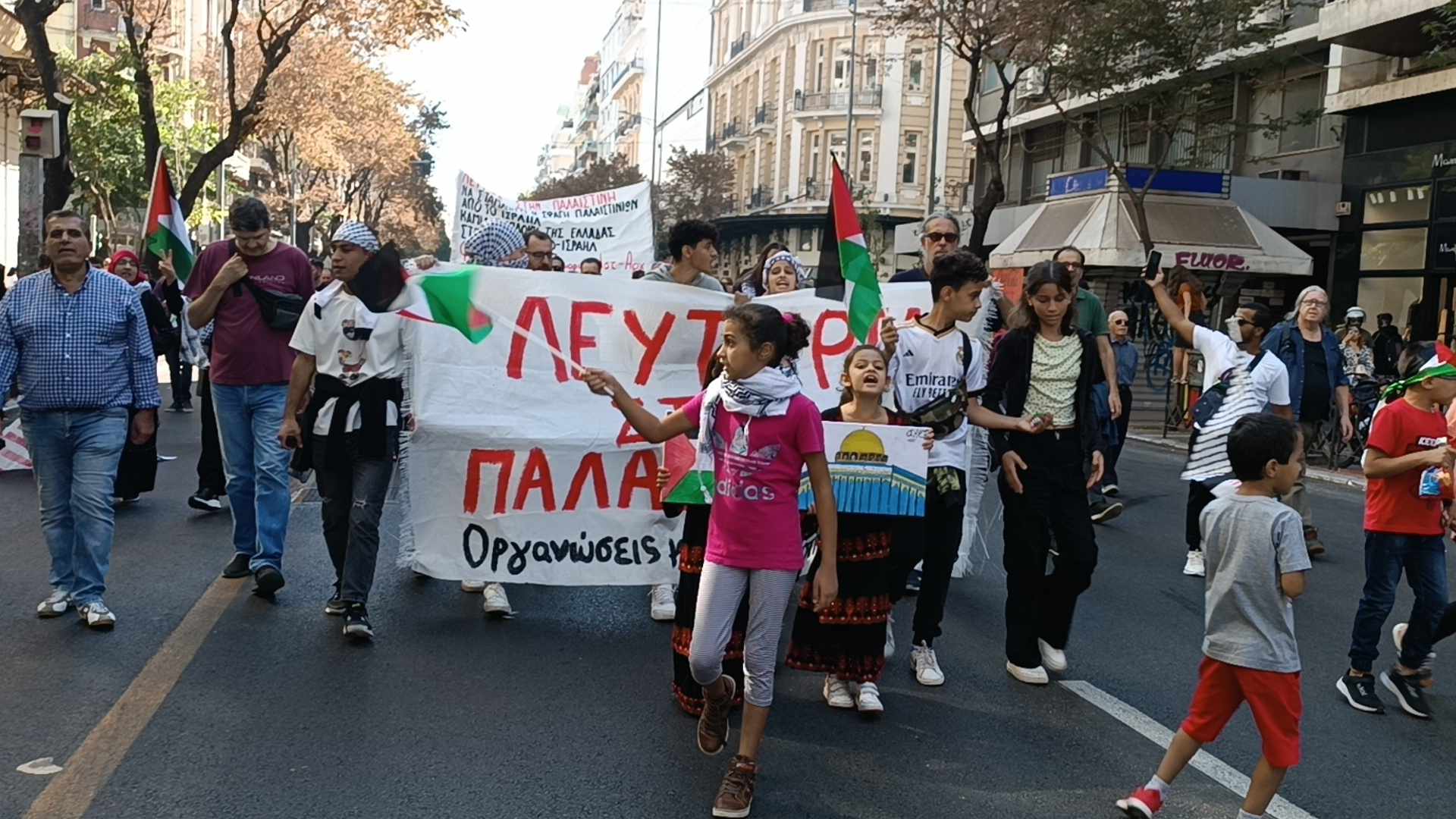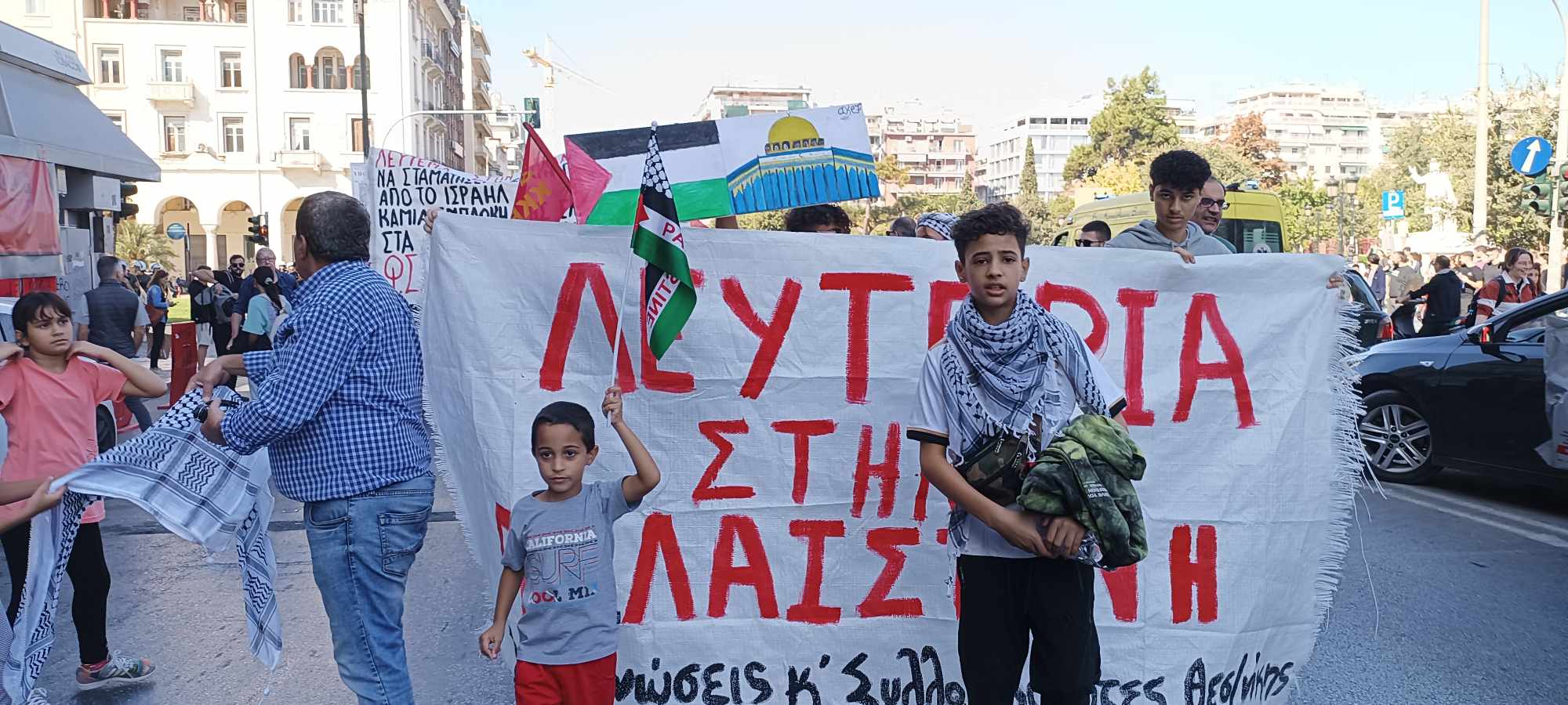 Με σύνθημα «Λευτεριά στην Παλαιστίνη» και με μέλη της παλαιστινιακής Κοινότητας Θεσσαλονίκης στην κεφαλή της πραγματοποιήθηκε σήμερα το μεσημέρι διαδήλωση στήριξης του παλαιστινιακού λαού.