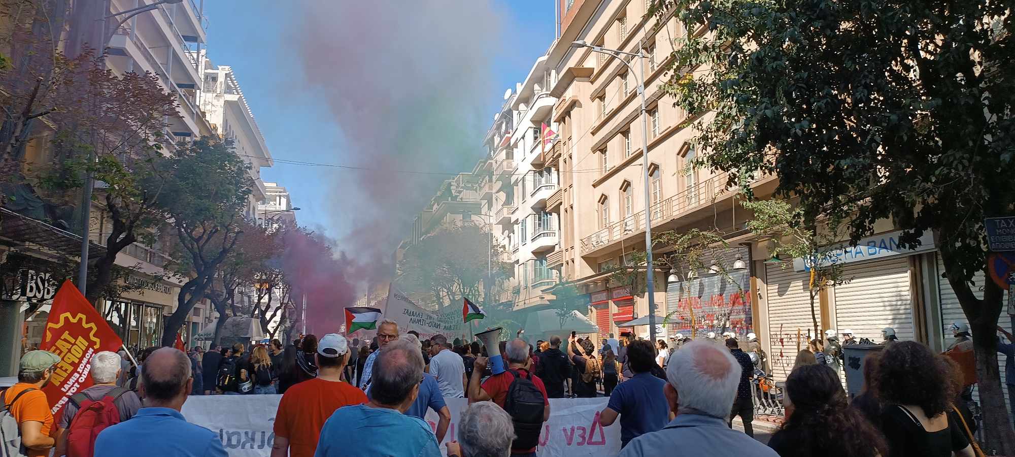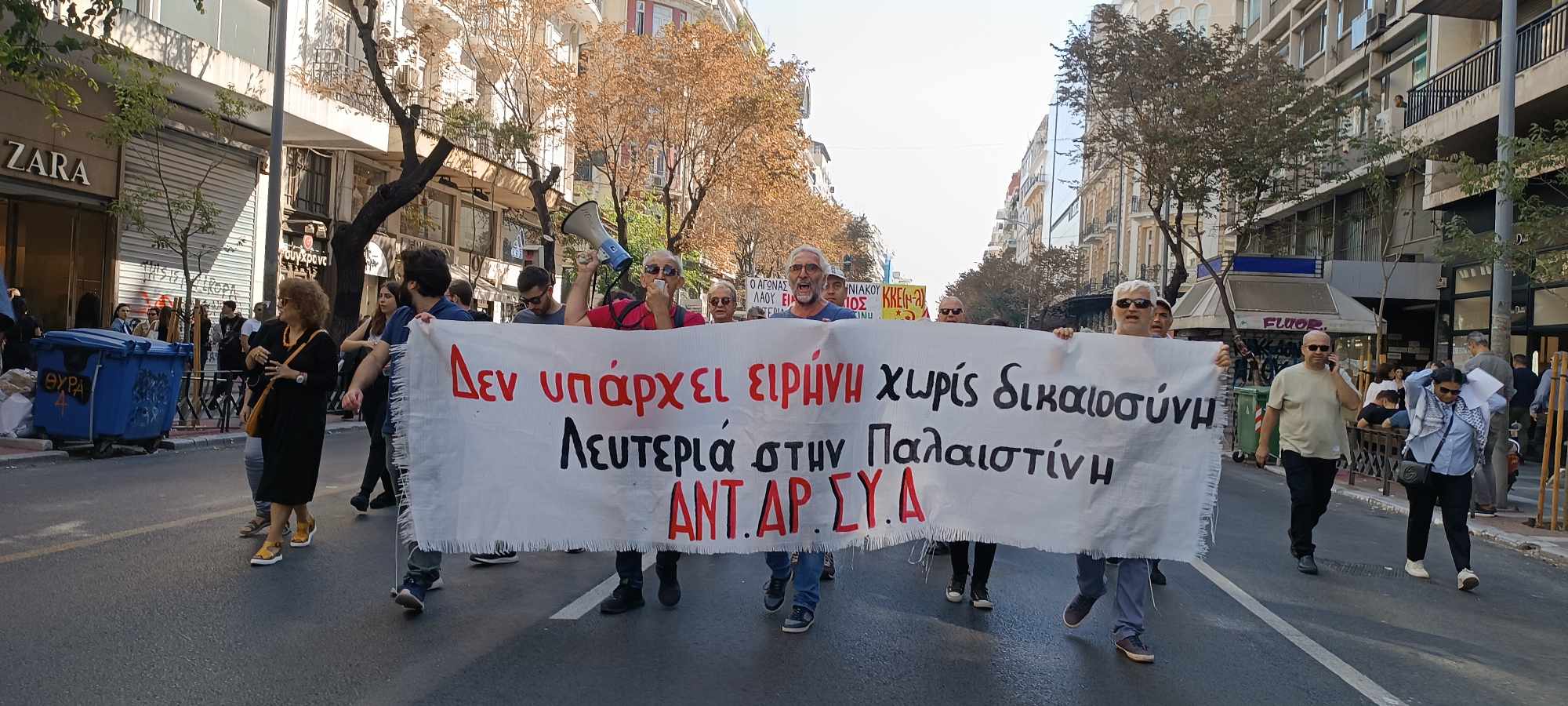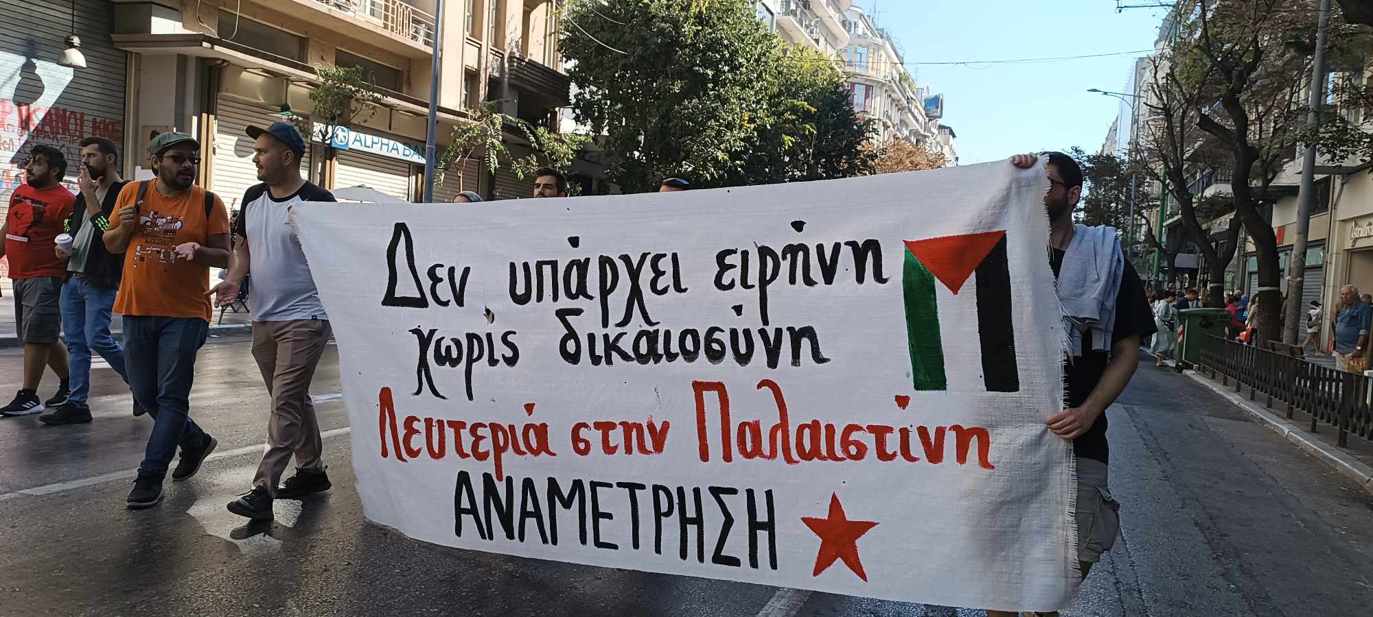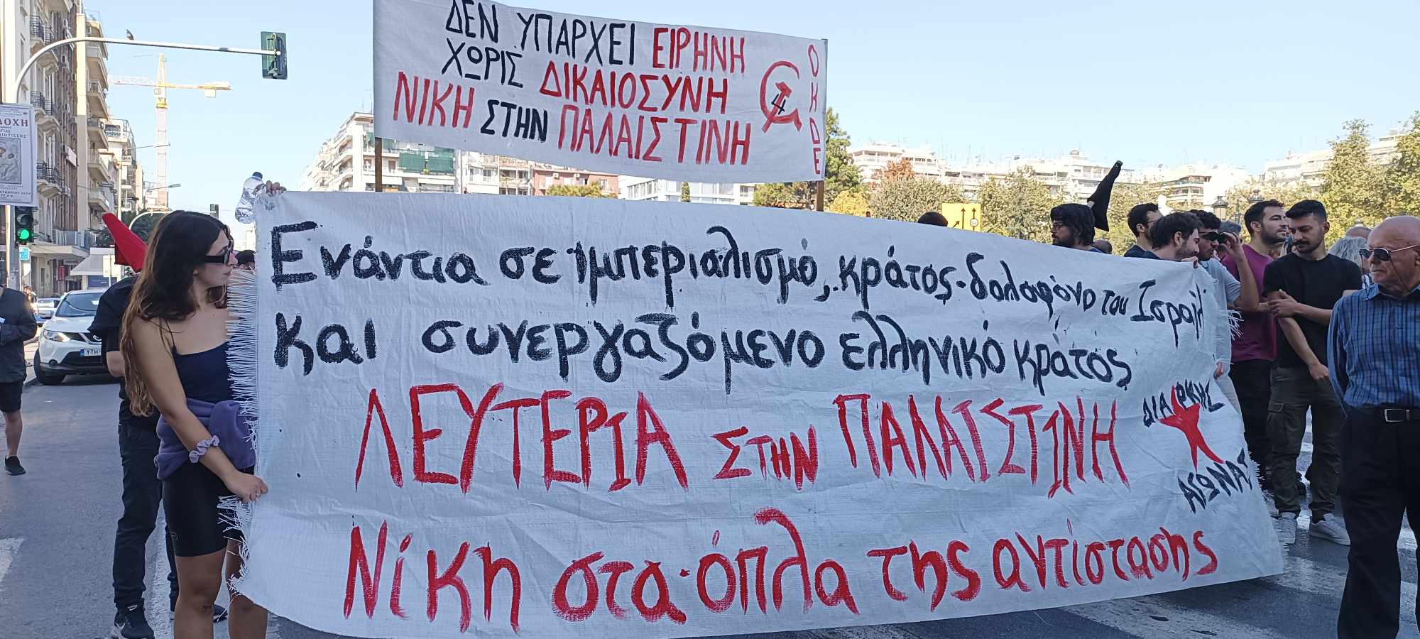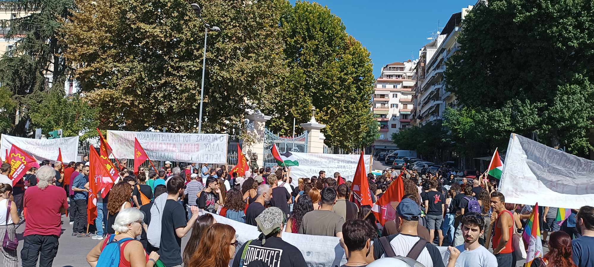 «Καταδικάζουμε τις επί 70 και πλέον χρόνια σφαγές, εκτοπίσεις, αρπαγές της γης του Παλαιστινιακού λαού. Η φυλάκιση 2.500.000 ανθρώπων (οι περισσότεροι ήδη πρόσφυγες από άλλες περιοχές της ιστορικής γης της Παλαιστίνης που βρίσκονται υπό κατοχή), σε μια φυλακή 362 τ.χλμ. στη Λωρίδα της Γάζας, η συνέχιση των εποικισμών, η διαρκής εξόντωση άμαχων και παιδιών, η φυλάκιση χιλιάδων (ακόμα και χωρίς κατηγορίες και δίκη) προκαλεί την απόλυτα δικαιολογημένη αντίσταση του παλαιστινιακού λαού» σημειώνουν μεταξύ άλλων οργανώσεις και συλλογικότητες της αριστεράς και του αντιεξουσιαστικού χώρου.Η διαδήλωση ξεκίνησε από το άγαλμα Βενιζέλου, πέρασε μπροστά από το Αμερικάνικο προξενείο και κατέληξε στο ΥΜΑΘ.