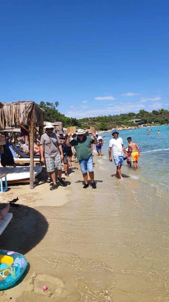 Με το κεντρικό πανό να γράφει «ελεύθερες και προσβάσιμες παραλίες για όλους» η πορεία κινήθηκε παράλληλα με την ακτογραμμή, ανάμεσα από τις δεκάδες ομπρέλες και ξαπλώστρες που εδώ και χρόνια κατακλύζουν κάθε καλοκαίρι μια από τις πιο όμορφες παραλίες της Χαλκιδικής.