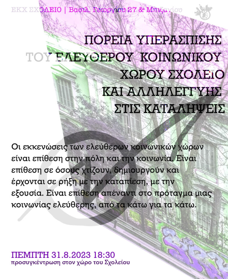 Εδώ είναι που αναδεικνύεται και η σημασία των ελεύθερων κοινωνικών χώρων και καταλήψεων όπου οι εκκενώσεις τους είναι επίθεση στην πόλη και την κοινωνία, είναι επίθεση σε όσους χτίζουν και δημιουργούν και έρχονται σε ρήξη με την καταπίεση, με την εξουσία. Είναι επίθεση απέναντι στο πρόταγμα μιας κοινωνίας ελεύθερης, απο τα κάτω για τα κάτω. Μέσα σε αυτή τη δυσοίωνη προοπτική, το “Σχολείο”, οι καταλήψεις, οι κοινωνικοί χώροι είναι σημεία συνάντησης ιδεών, συλλογικοποίησης αγώνων και της ζωής μας ευρύτερα. Είναι χώροι όπου καθορίζονται νέες τοπολογίες και ανα-δημιουργούνται ζωές ελεύθερες από εξουσία, όπου η αλληλεγγύη και η συμπερίληψη είναι τρόπος ζωής και όχι σλόγκαν σε προεκλογικές καριέρες. Για μια ζωή ελεύθερη στο σήμερα, στο αύριο, στο τώρα.