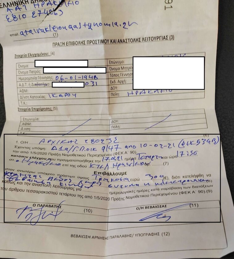Το περιστατικό φέρνει στο φως το τοπικό site candiadoc.gr δημοσιεύοντας και το έγγραφο με το διοικητικό πρόστιμο που επεβλήθη στον 72χρονο άστεγο, ενώ τα στοιχεία του ανθρώπου βρίσκονται και στη διάθεση της κοινωνικής υπηρεσίας του Δήμου Ηρακλείου.